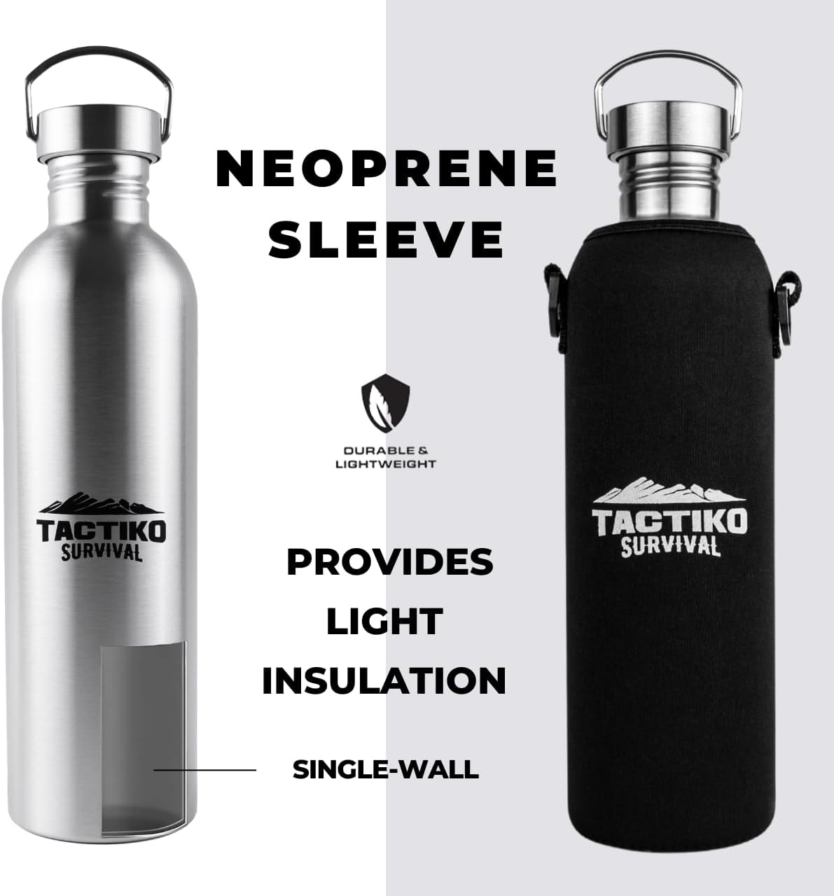 Tactiko Survival Stainless Steel Wide Mouth Water Bottle, Single Wall Boil-Safe, Leakproof, BPA-Free with Carry Sleeve and Strap for Camping, Hiking, Outdoor Prep (Black, 51 oz / 1500 ml)