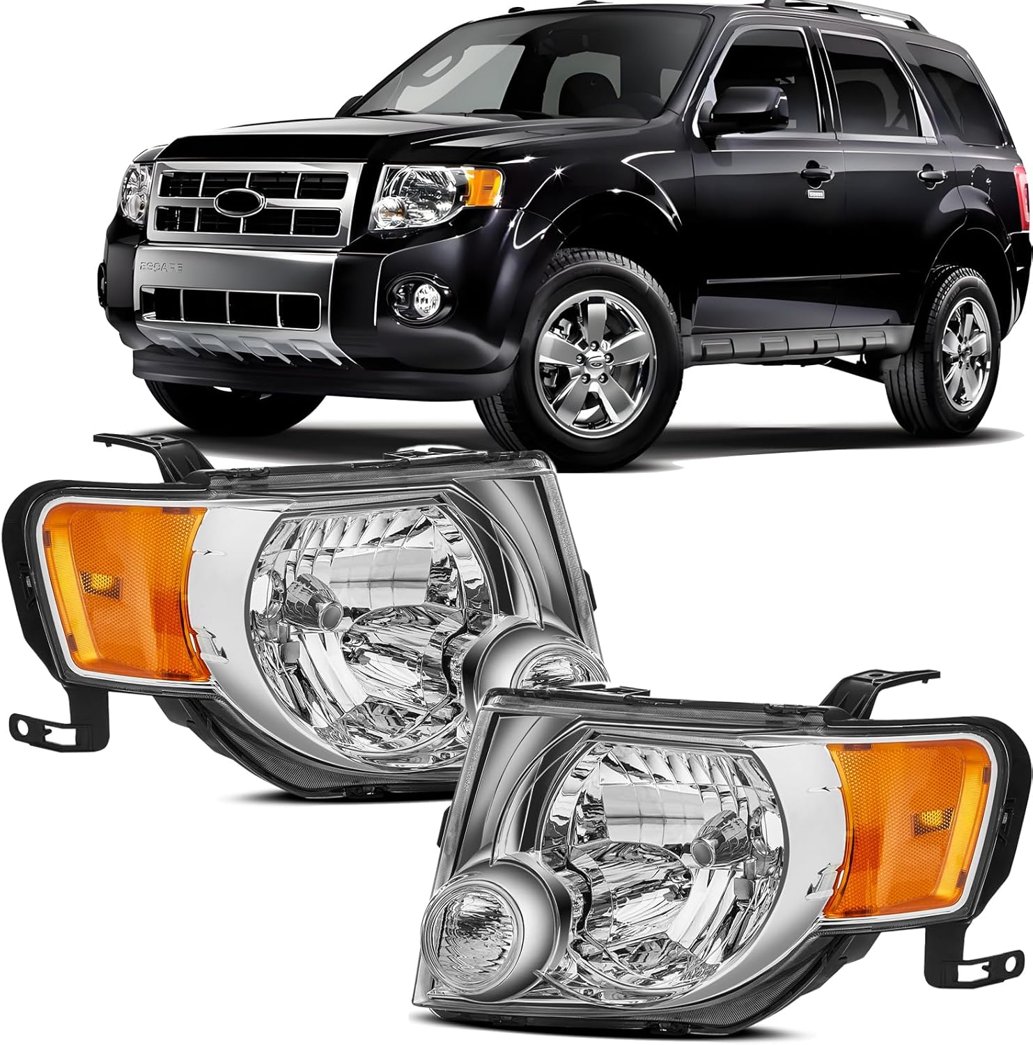Headlights Assembly compatible with 2008 2009 2010 2011 2012 Ford Escape Headlamp, Chrome Housing Amber Reflector Clear Lens