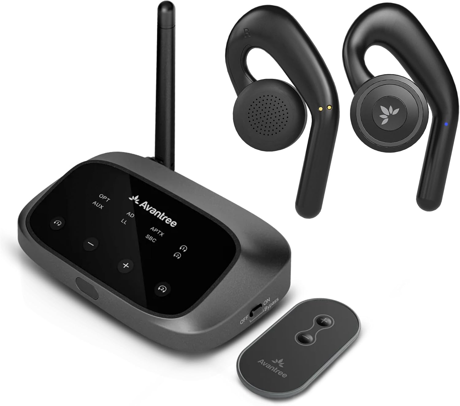 Avantree Oasis Plus 2 - Bluetooth Transmitter for TV with Remote Volume Control & Avantree TWS116 - Open-Ear Wireless Headphones & Charging Dock with Surroundings Awareness