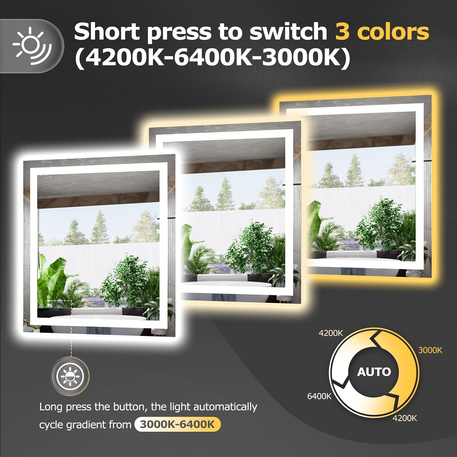 [3 Colors & Customize Lights Color]: This smart bathroom led mirror is multifunctional. You can switch the color temperature between warm light (3000k), natural light (4200k) and white light (6400k).Long press the button the light will automatically cycle gradient from 3000K-6400K ,just customize the brightness and light color to your preferred level