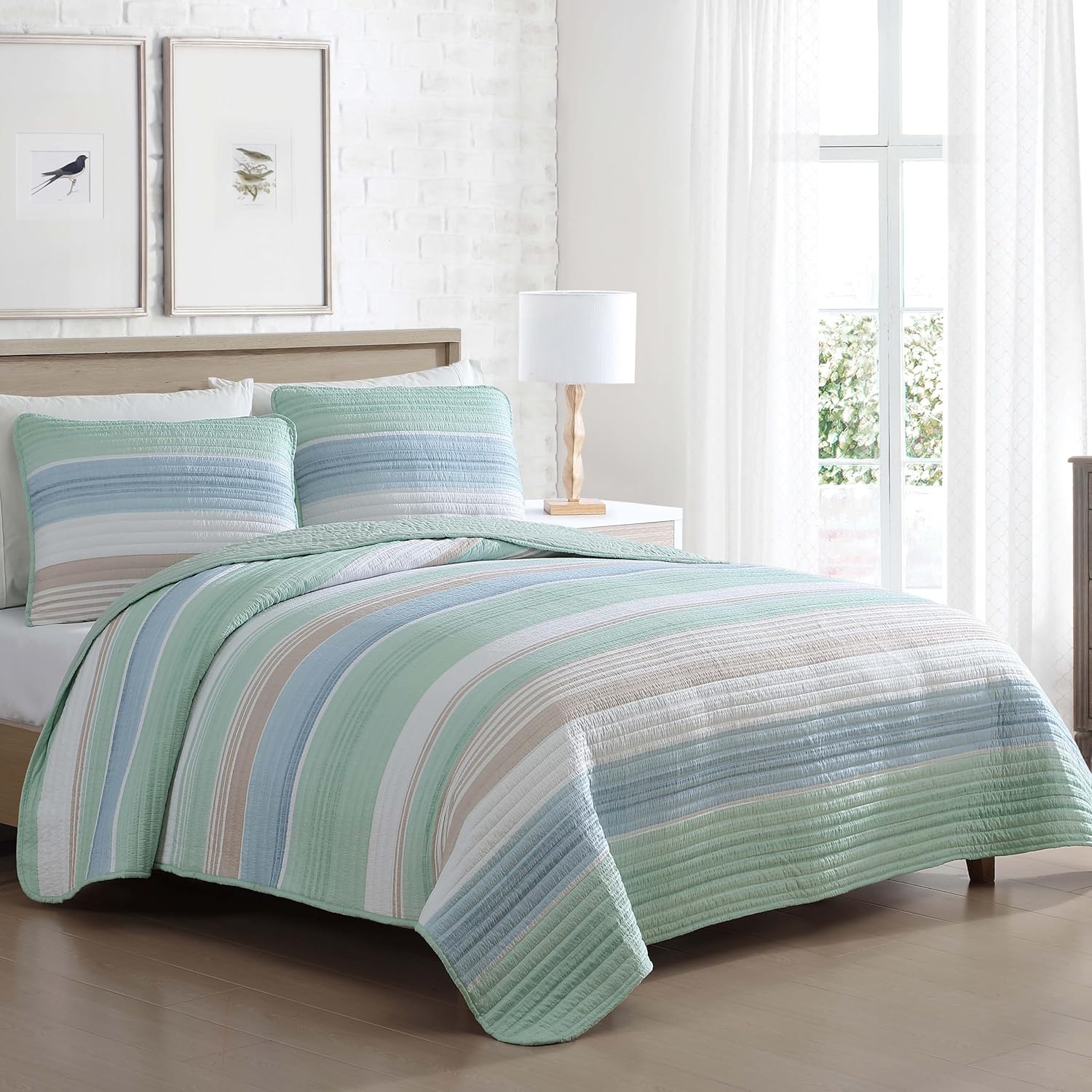Beatrice Home Fashions Coralinn Striped 3-Piece Quilt Set, Lightweight, All-Seasons, King, Sage Blue