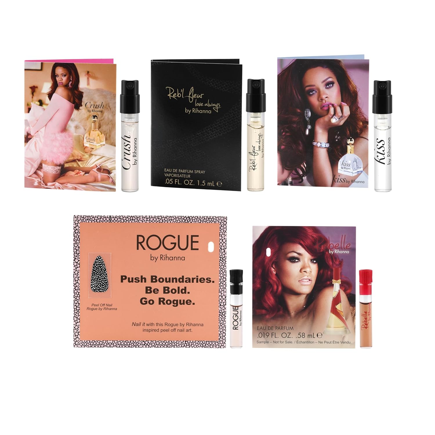 5 Rihanna perfume samples for women: Crush, Reb'l Fleur, Kiss, Rogue, and Rebelle. Fragrance sample vial bottles perfume Set. Great for small gift or to try before purchasing bigger bottles.