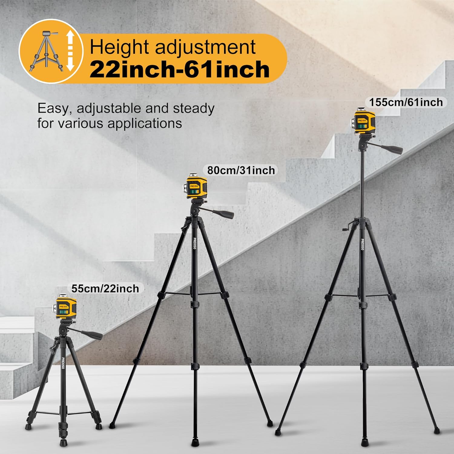 Adjustable 3-Section Legs & 360° Horizontal Rotation: The tripod for laser level features 3-section legs with height adjustment, extending up to 61 inches (155cm). With features of 360° horizontal rotation and 90° vertical tilts, the tripod will provide max flexibility for the user to achieve the desired projection height and angle