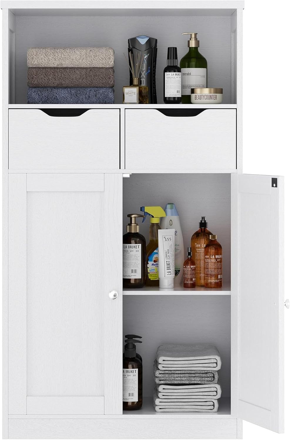 Walsunny Bathroom Storage Cabinet, Floor Storage Cabinet with 2 Drawers, Doors and Adjustable Shelves, Freestanding Wood Organizer for Bathroom Living Room Kitchen Entryway, White