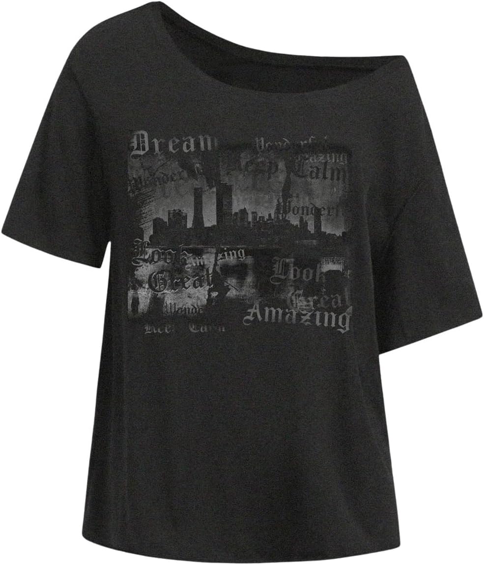 Women's Off The Shoulder Tops Graphic Goth Tee Y2k Vintage Asymmetrical Neck Oversized T Shirts