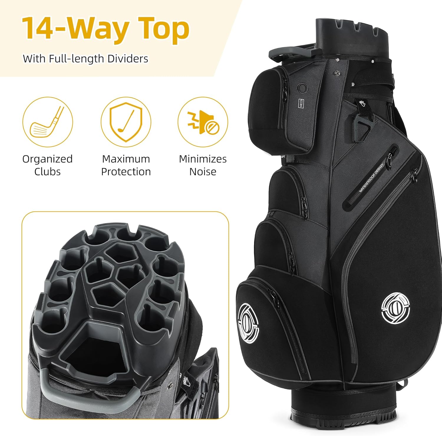 Golf Cart Bag, 14 Way Molded Lock Top Club Bag with Full-Length Dividers, Silence Cart Bags for Men with Handles Ergonomic Padded Strap, Rain Hood