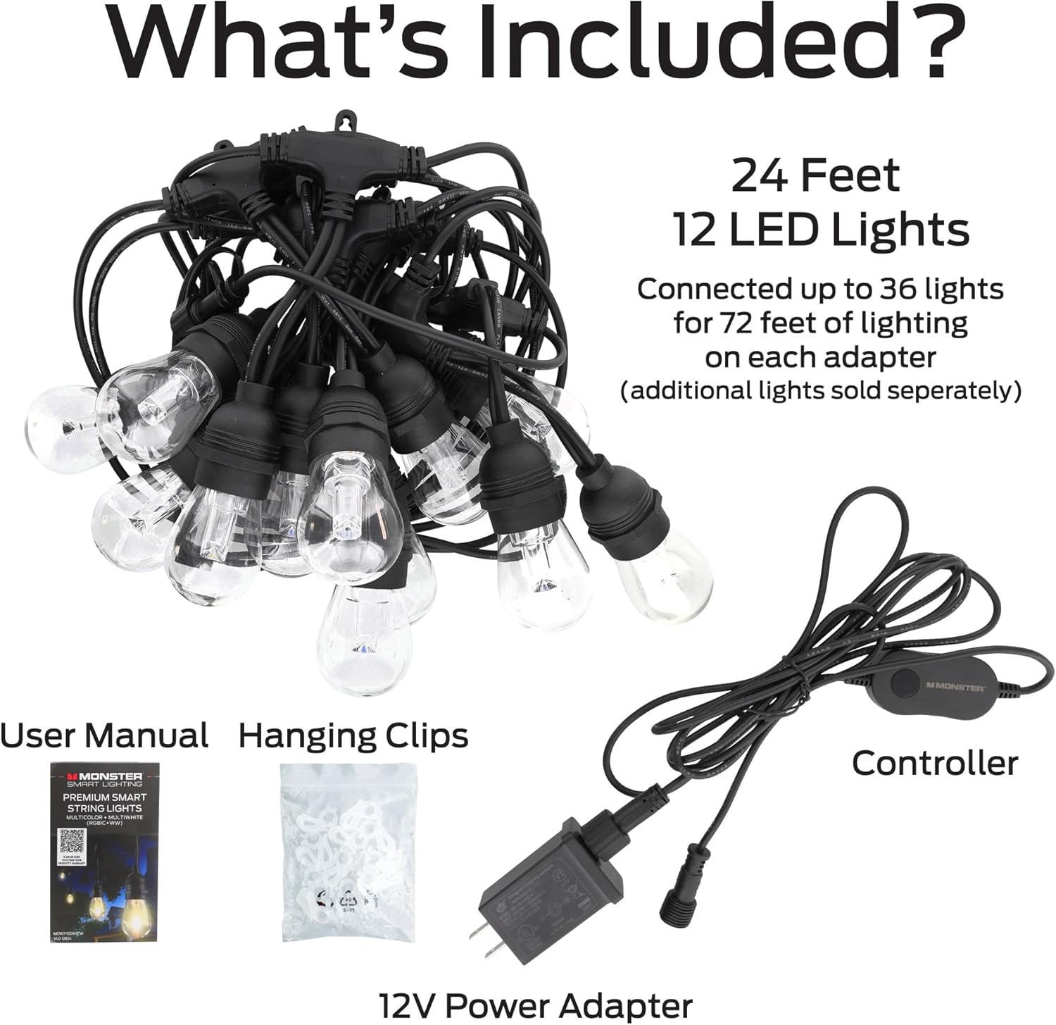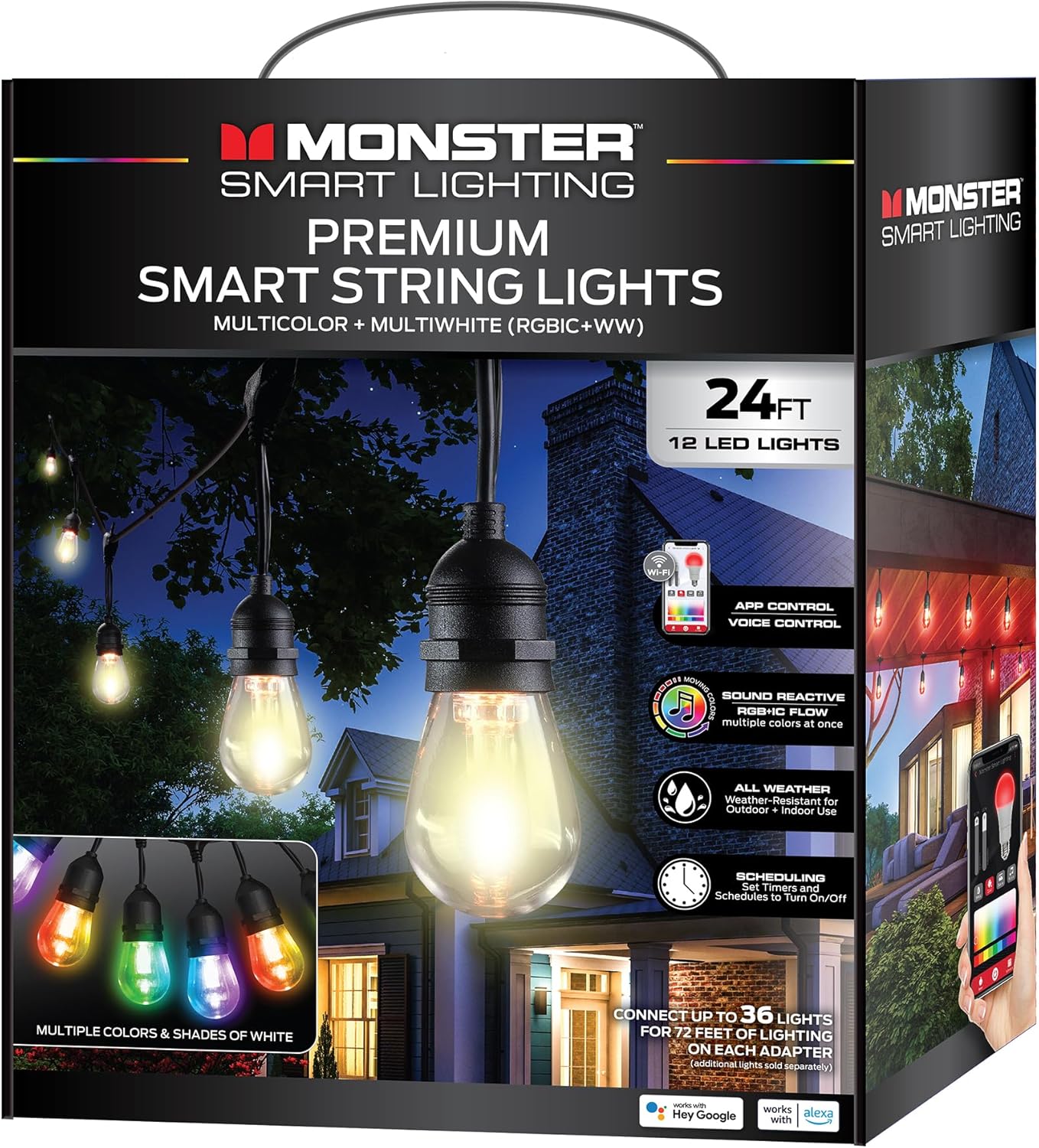 Monster 24 Foot Premium Outdoor Smart RGB+IC+WW String Lights, 12 Bulb Color Flow Dimmable LEDs, Sound Reactive, Water & Weather Resistant, Compatible with Alexa, Siri, Google Home, App