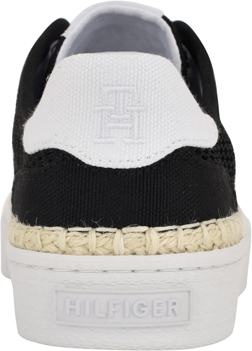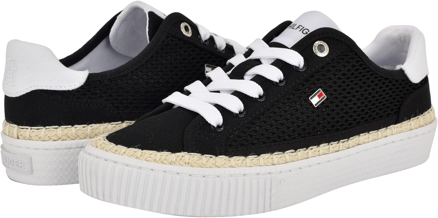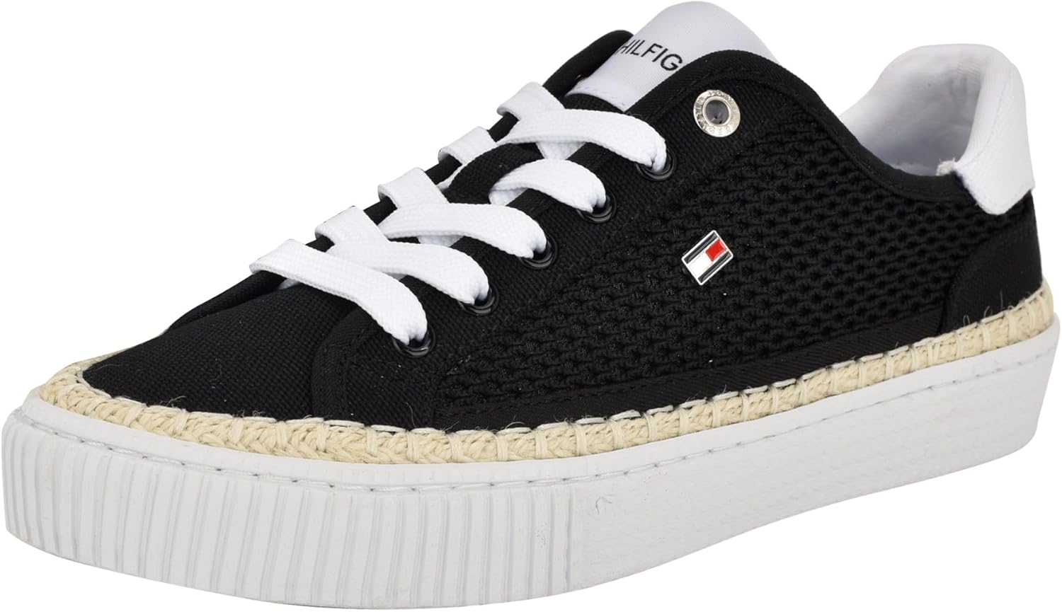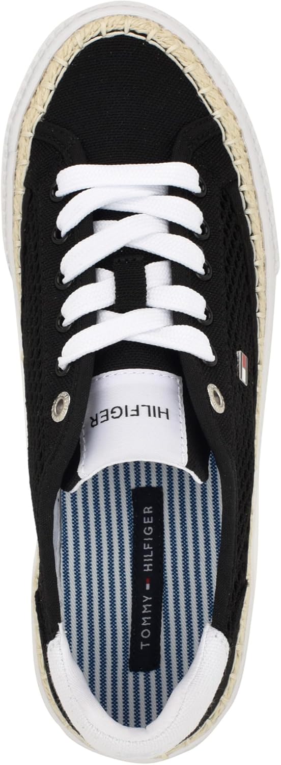 The Tommy Hilfiger Women's Chirley with espadrille-inspired rope wraps around a sophisticated platform sneaker with enameled logo hardware and cool mesh and canvas upper. It features round toe, lace-up closure, and brand detailing on the tongue, and footbed. Cotton lining, and rubber insole. Rubber outsole.