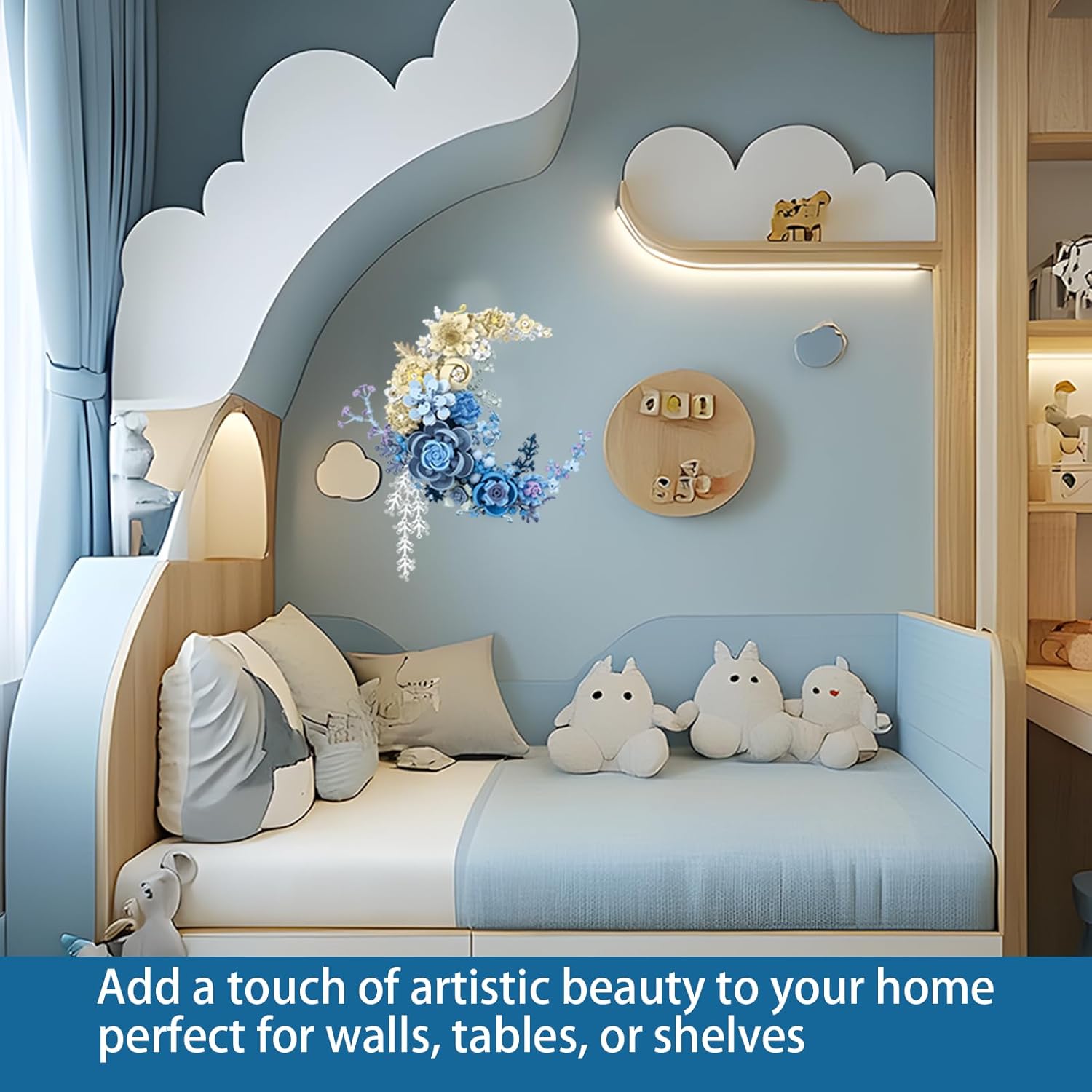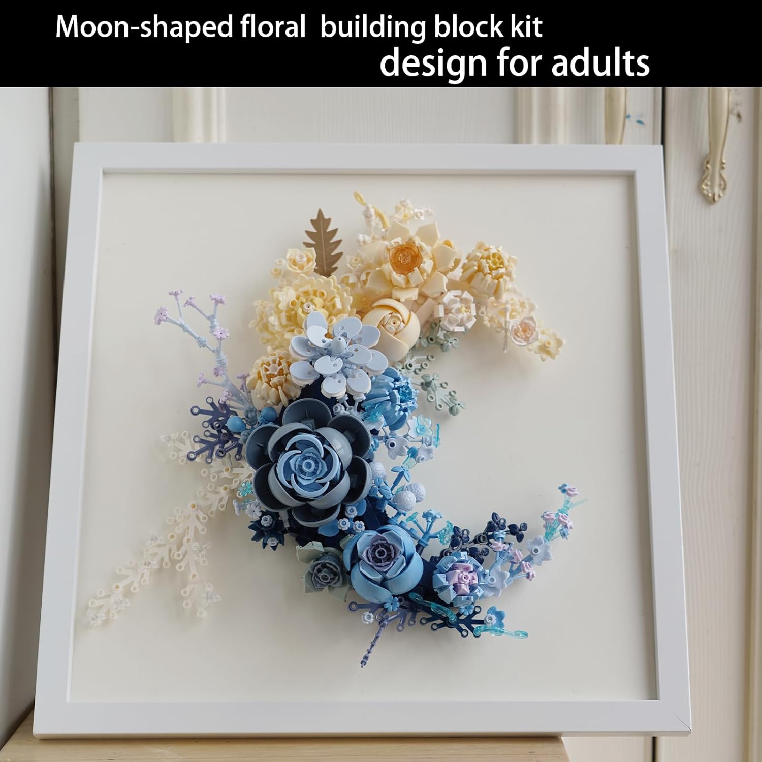 A Uniquely Designed Artistic Display : Build a one-of-a-kind model kit for adults! This unique creation features a romantic blue crescent moon adorned with a vibrant arrangement of realistic blooms like roses, daisies, and jasmine. It’s a sophisticated piece of art that symbolizes romance and elegance, making it a standout decoration for any setting.