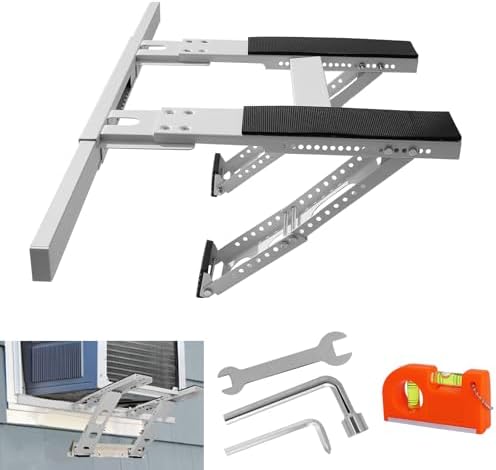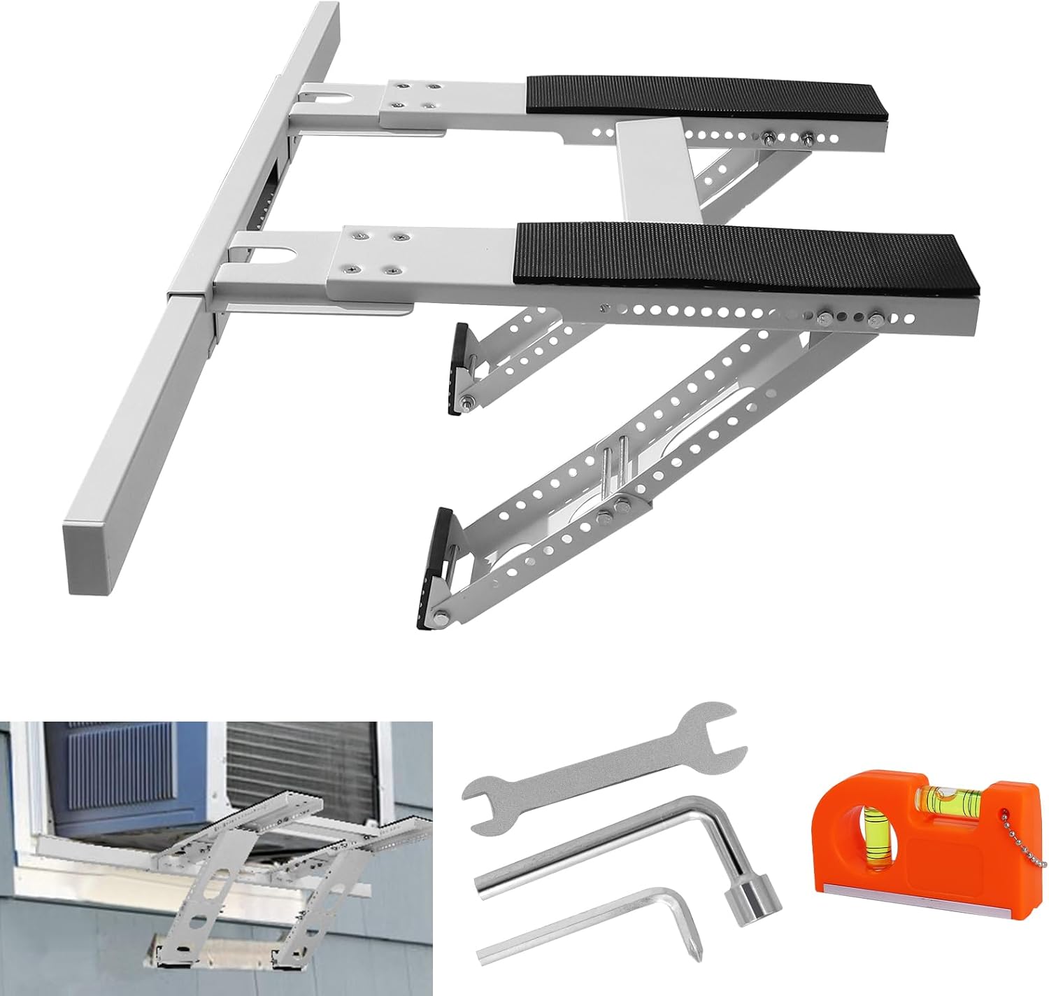 Adjustable Design: The window ac support bracket's telescoping arms extend from 34.6 to 41.7 inches, fitting walls 3 to 11 inches thick. Support legs and extension beams provide additional stability for inside & outside. Non-slip rubber feet enhance stability, and the included bubble level ensures easy alignment during installation, guaranteeing a secure and level setup for your air conditioner