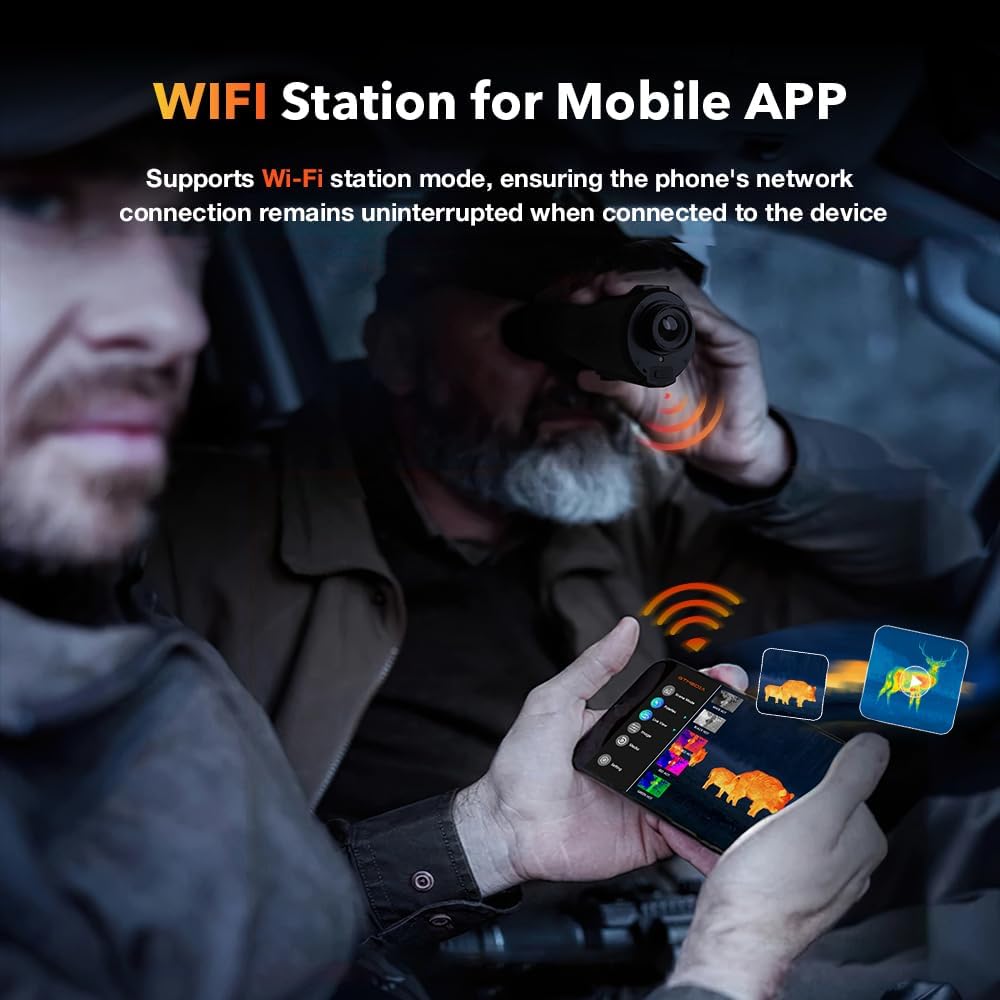 Support Wi-Fi Hotspot/Station Model]Our thermal monocular night vision supports both Wi-Fi hotspot and station modes. Unlike similar products on the market that only support hotspot mode, which results in the phone disconnecting from the network when connected to the device, we have solved this problem through station mode. This allows the phone to maintain network connectivity while connected to the thermal imager monocular