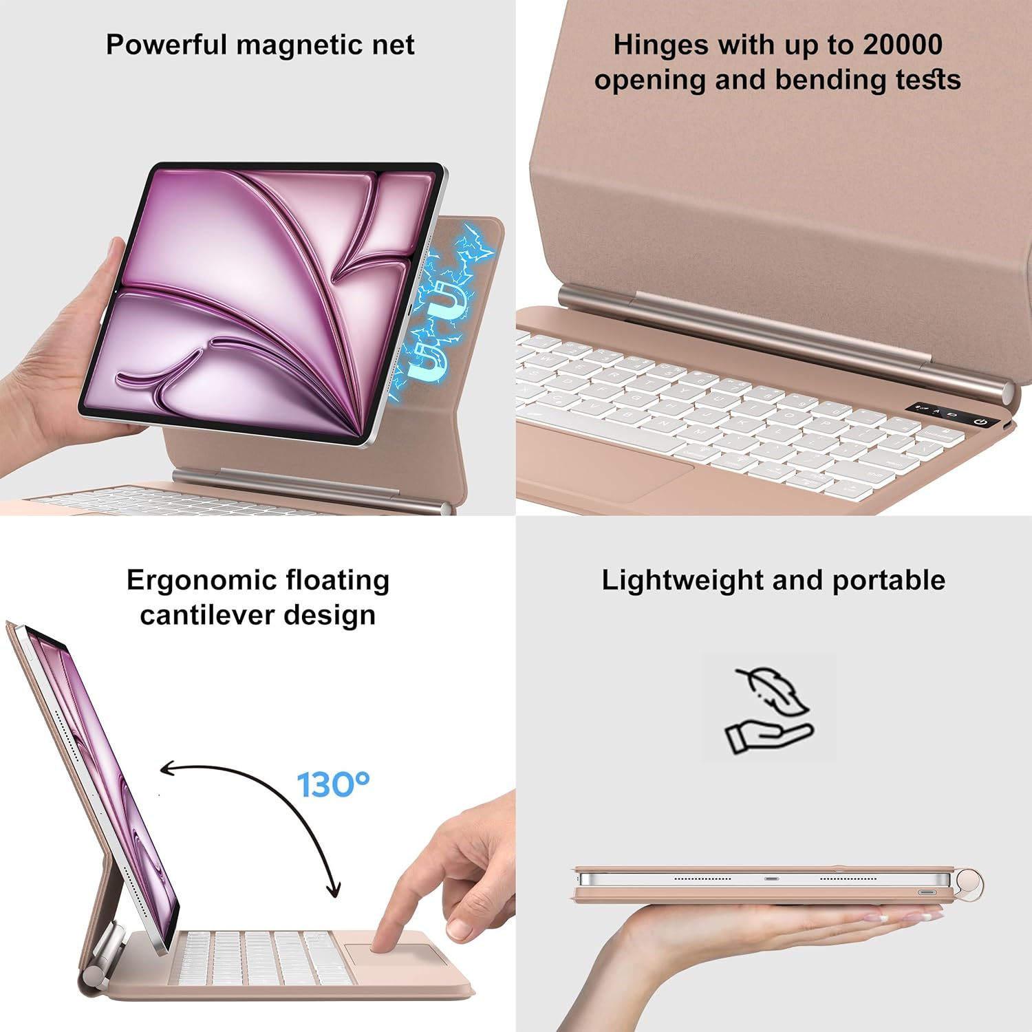 💫【Easy-Set Floating Magnetic Stand】The durable aluminum alloy hinge holds the floating cantilever stand firmly in place. Lots of small magnets are built into the PU leather back cover, allowing you to attach your Tablet magnetically and transform it into a laptop in a second. The magnetic stand can be adjusted smoothly to achieve a perfect viewing angle for typing, reading, and watching.