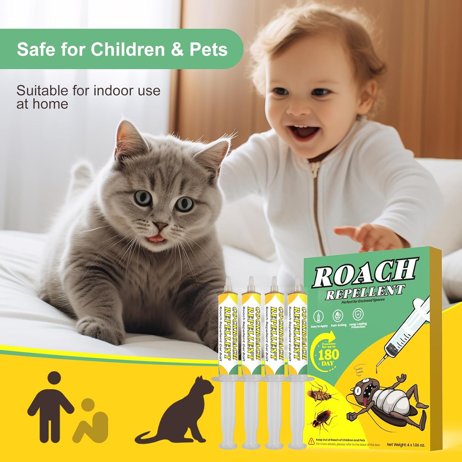 Roach Killer Indoor Infestation Safe for Indoor Use: Designed with your family’s safety in mind, our cockroach gel bait is made from a non-toxic formula that is safe to use around children and pets when applied as directed. Its targeted application method minimizes exposure while effectively eliminating cockroaches. Ideal for use in kitchens, bathrooms, living rooms, and other indoor spaces, it offers peace of mind without compromising on performance.