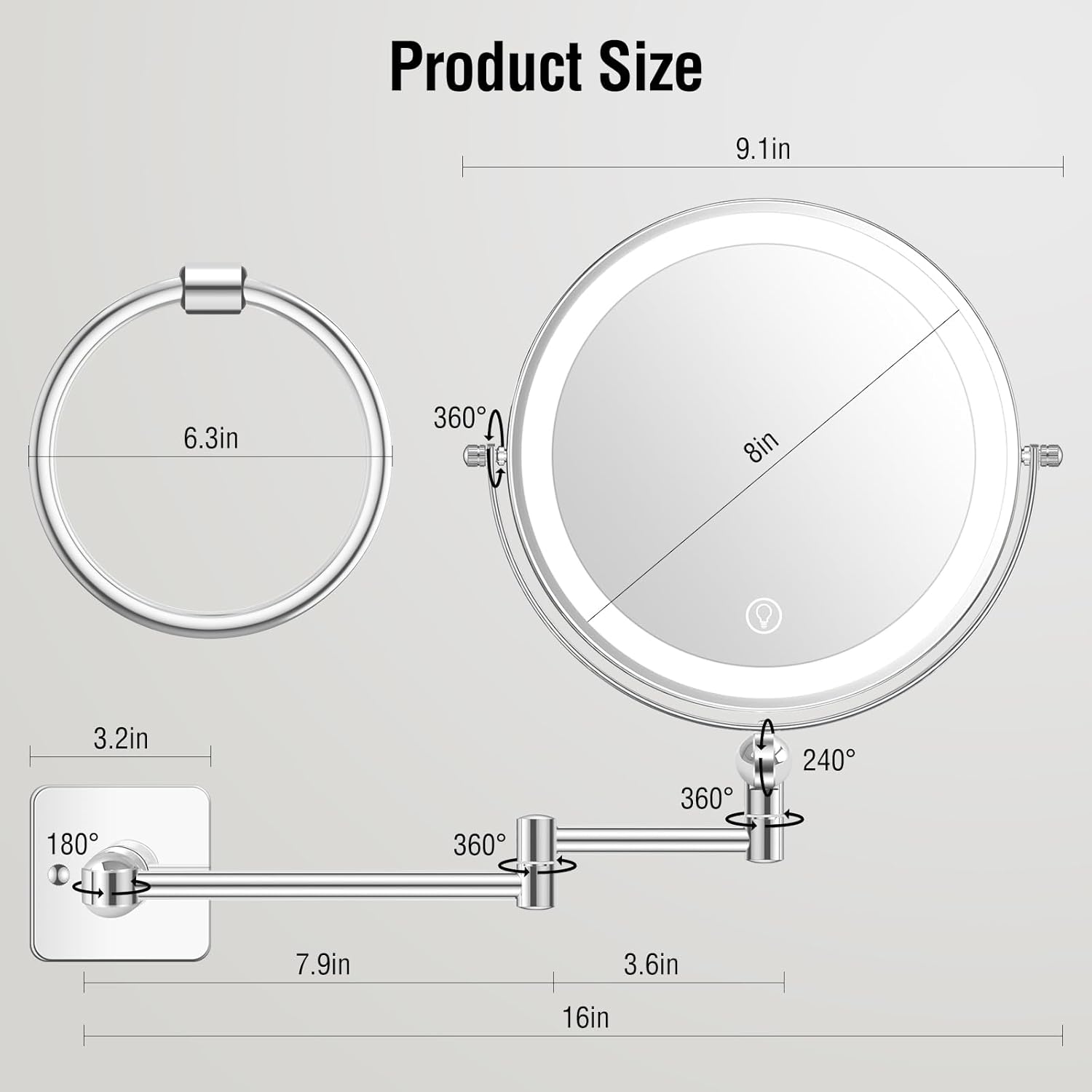 Adjustable height design, the mirror adopts an adjustable height design, you can adjust the mirror height according to your own needs. It can meet the high usage needs of men, women, and the elderly. With the help of extendable arms, the wall mirror can easily stretch to meet your optimal usage angle