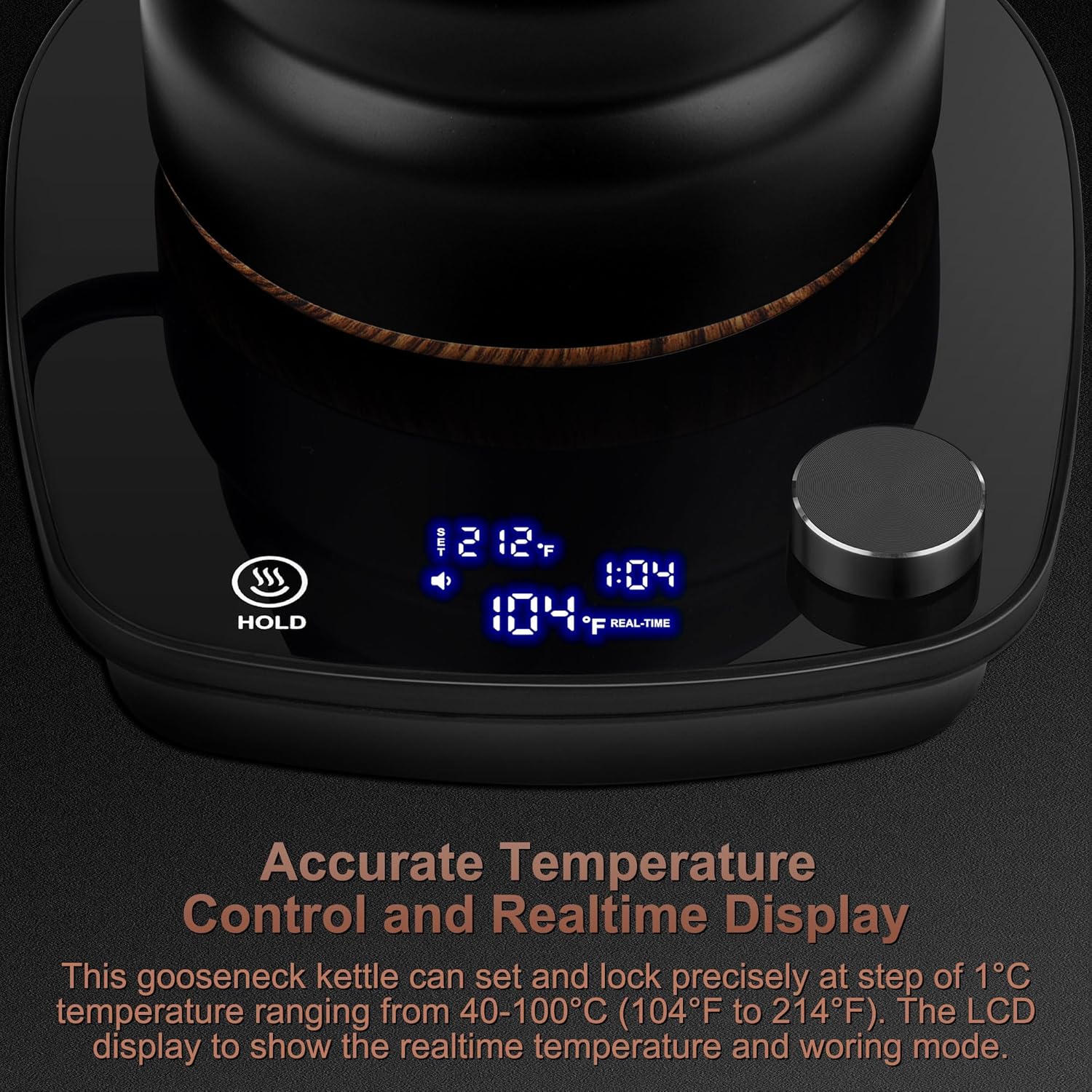 【Accurate & Realtime】This gooseneck electric kettle can set and lock precisely at step of 1°C temperature ranging from 40-100°C (104-212°F). The 2 inch LCD display to show the realtime temperature and set temperature, and other information like hold time, mute mode, heating status, stopwatch. *Please note that for the holding mode temp range is 40-98°C (104-208°F).