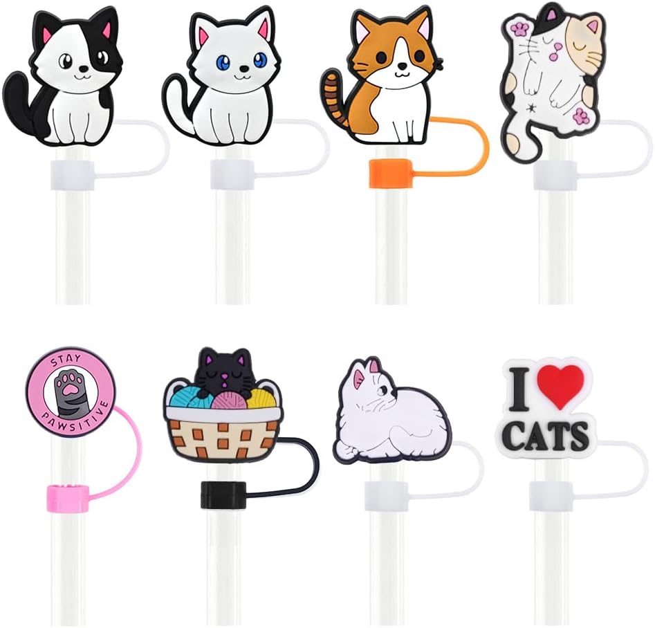 Silicone Cat Straw Toppers Cap for Stanley Cover Cap for Tumblers 30oz 40oz, 0.4 Inch/10mm 8PCS Cup Accessories Reusable Drinking Straw Covers Kit Tips Lids (Cute Cats)