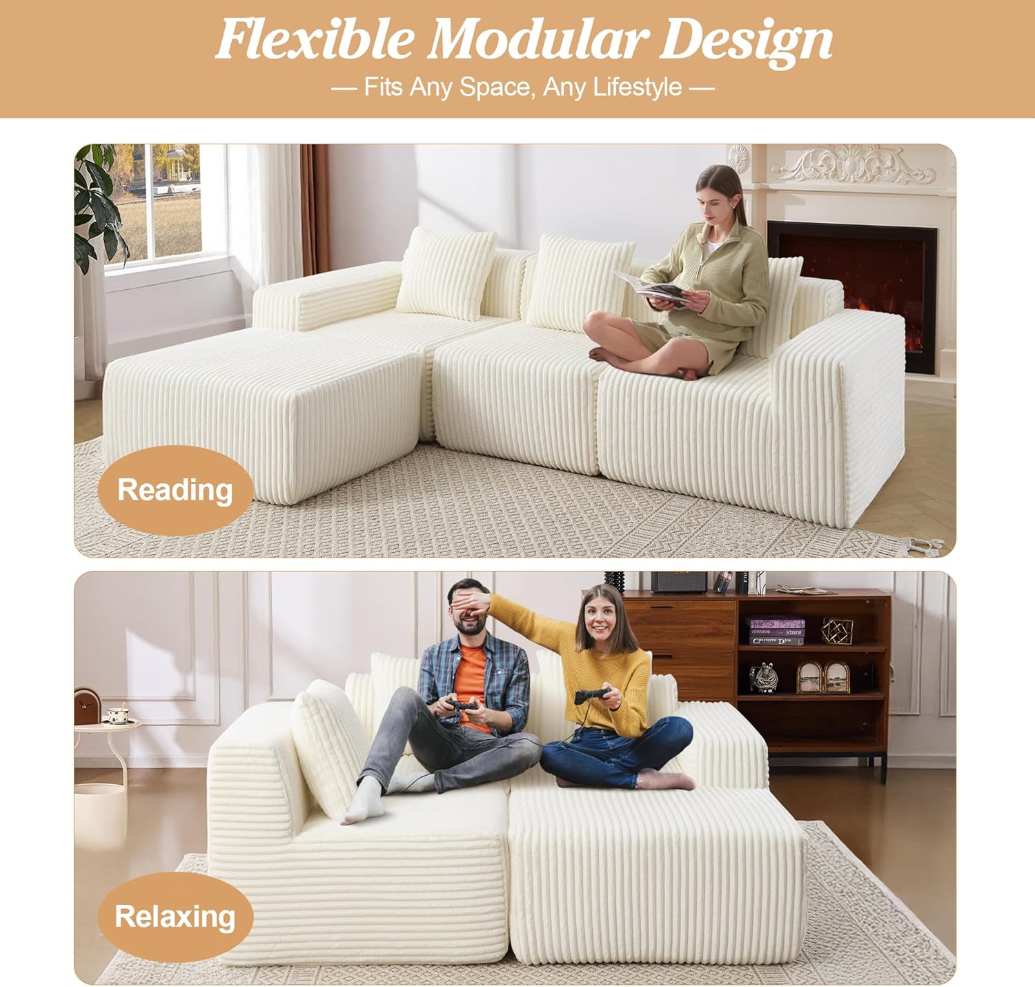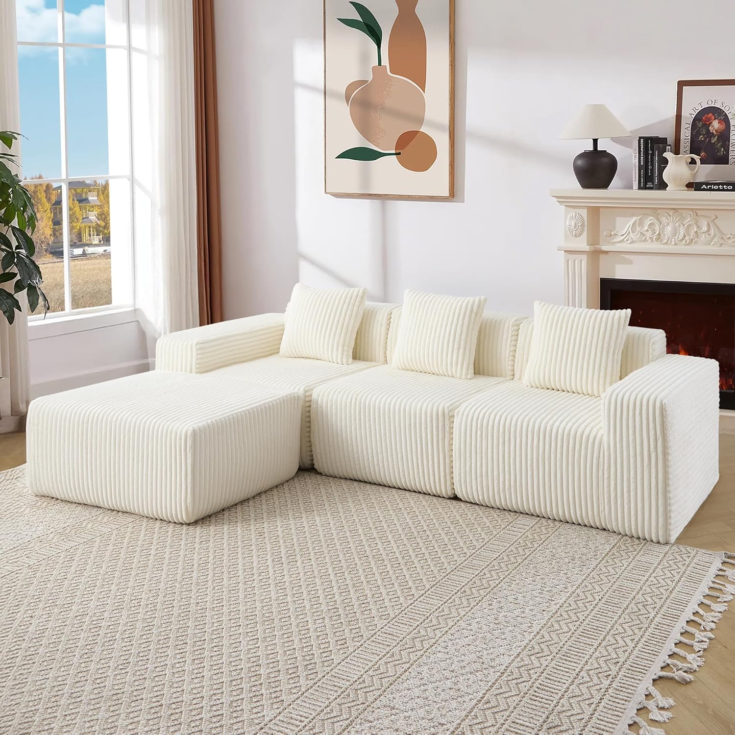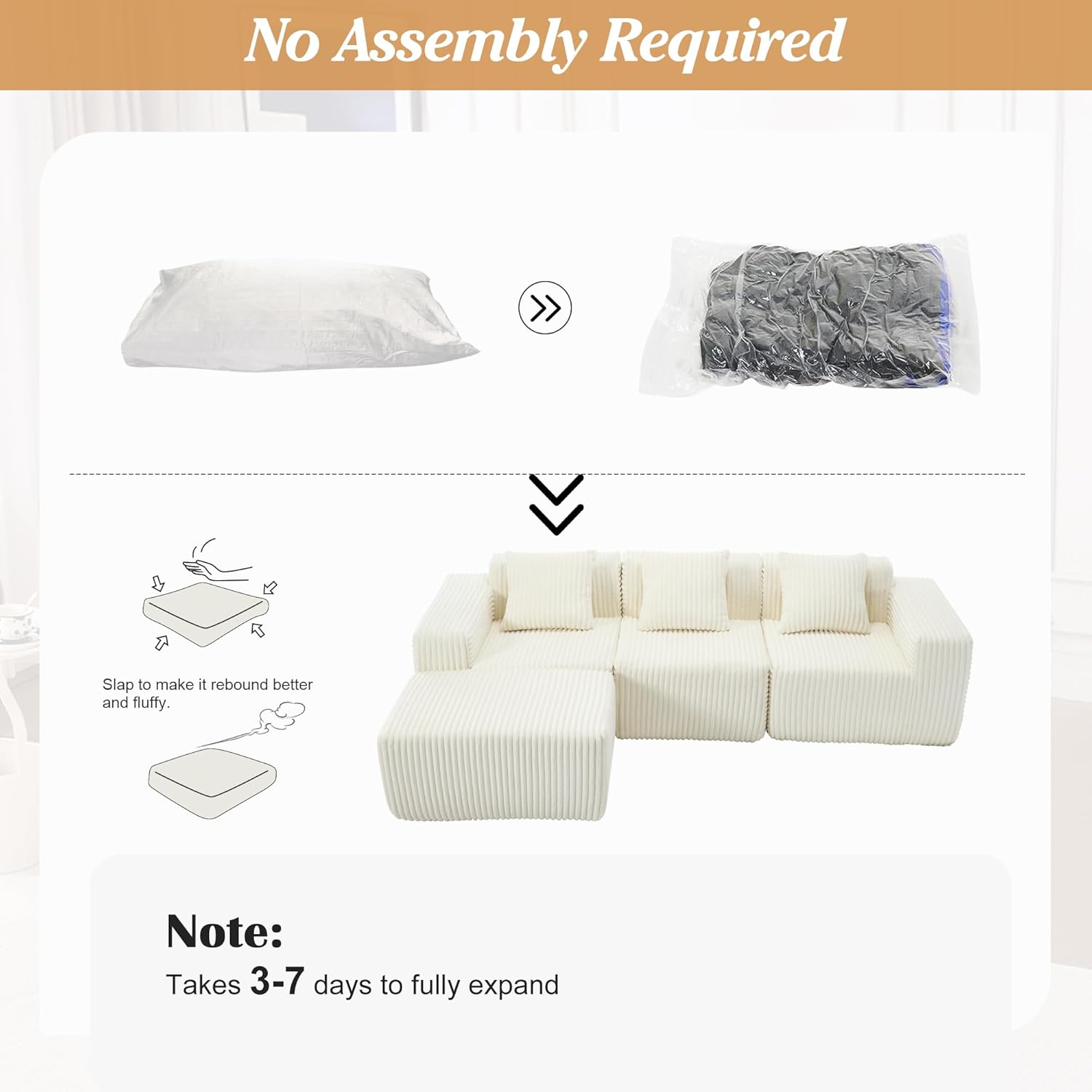 101" Cloud Couch Boneless Modular Sofa, Compression Memory Foam Sectional Couches, Comfy Corduroy L Shaped Sofas with Chaise Lounge for Living Room, No Assembly Required (Beige, 101in)