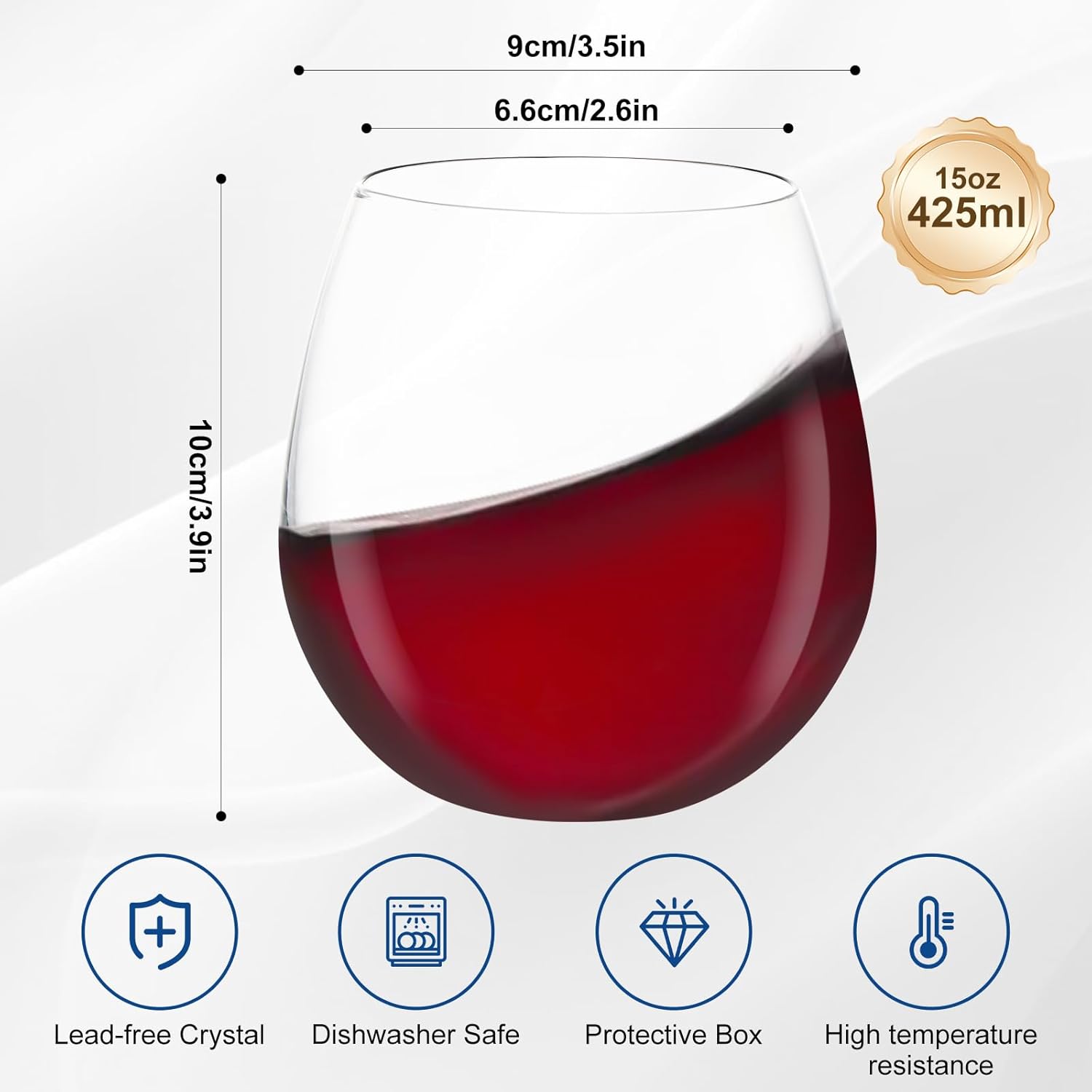 Stemless Wine Glasses Set of 6 – 15oz Elegant Modern Red & White Wine Glasses for Everyday Use, Dishwasher Safe, Shatter-Resistant Crystal-Ergonomic Design, Drinking Glasses Gifts
