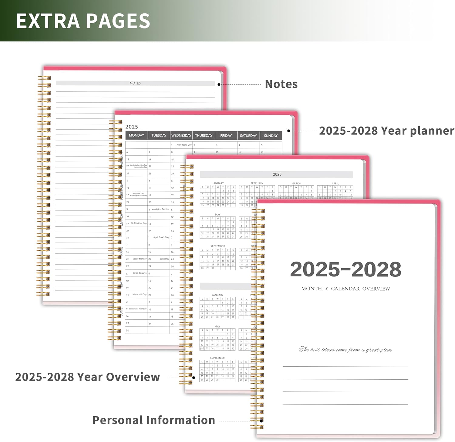 Functionality Perfected, Style Exemplified: 25-28 Calendar planner weekly and monthly, thick paper that exudes quality, and a hardcover cover adapting seamlessly to your lifestyle. Let monthly tabs and strong twin-wire binding elevate your planning journey, while the elastic band adds convenience for easy use. Contacts, a 2025 Yearly Overview, Reference Calendars, and 2025-2028Holidays enrich your journey
