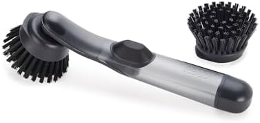 This refillable soap-dispensing dish brush is part of the Joseph Joseph SinkTech washing-up system, which includes a range of interchangeable heads, handles and accessories that extend its lifespan and make dishwashing easier. It features durable, stain-resistant bristles that deliver an effective clean each time, an integrated pan scraper for stubborn stains and comes with a replacement brush head. To release soap into the bristles, there is an easy-push button located on the handle. To refill, simply twist off the tip of the brush handle and add the required amount of liquid soap. Replacement heads and accessories available separately.
