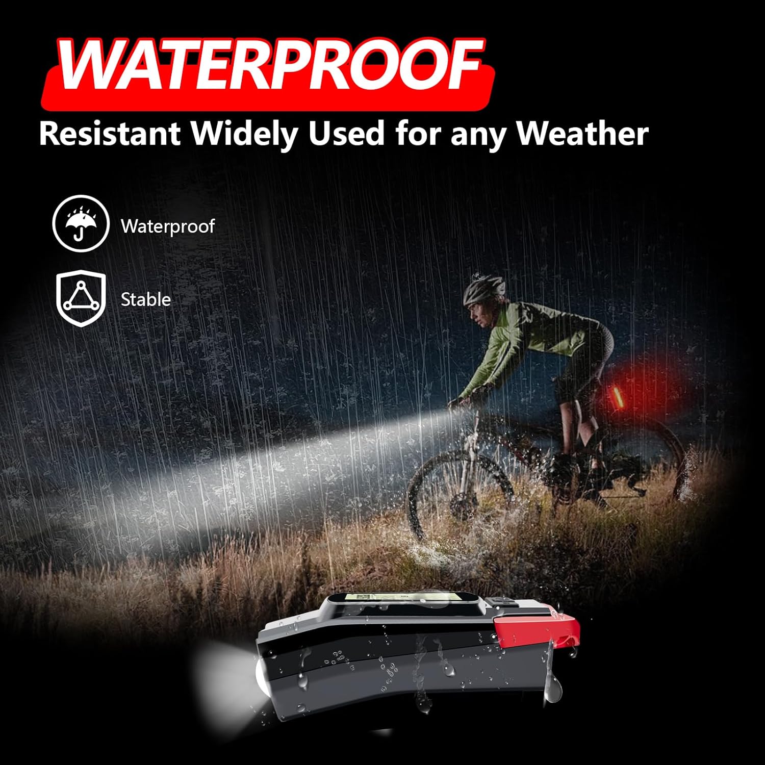 Weatherproof & Tool-Free Installation : Built from durable ABS with IPX5 waterproof rating, this bike light set withstands rain, dust, and rough terrain. The secure rubber mount attaches to handlebars in seconds without tools - no slipping, even on bumpy rides. Ideal for mtb lights for night riding or dirt bike headlight applications