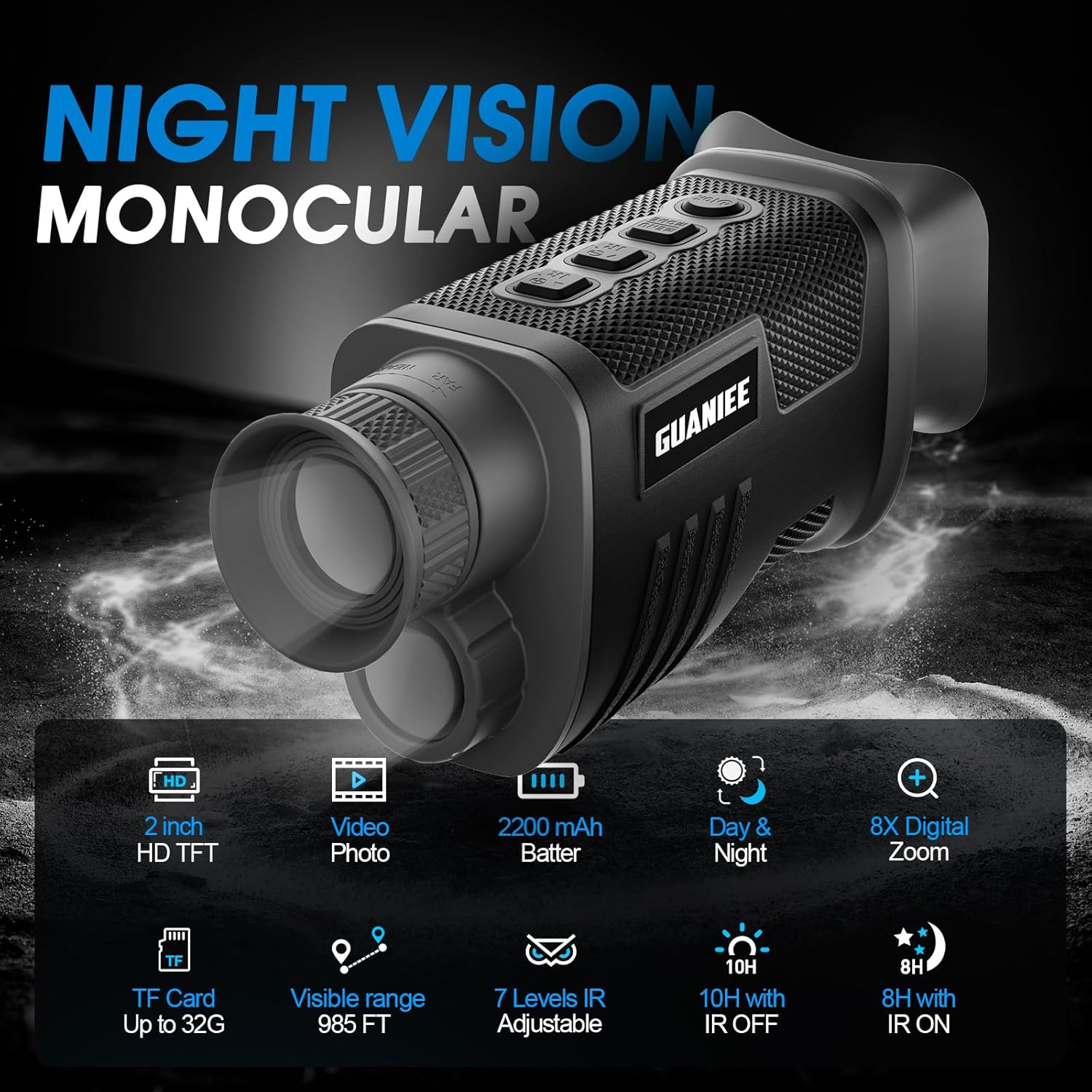 Long-lasting Battery Life: The night vision monocle has a built-in 2200mAh rechargeable battery with up to 720 minutes of use on normal settings.The Type-C charging port allows you to charge it with a rechargeable battery or car charger. This hunting night vision can take and record vivid and clear photos and videos of birds and wildlife and store them on the included 32GB memory card