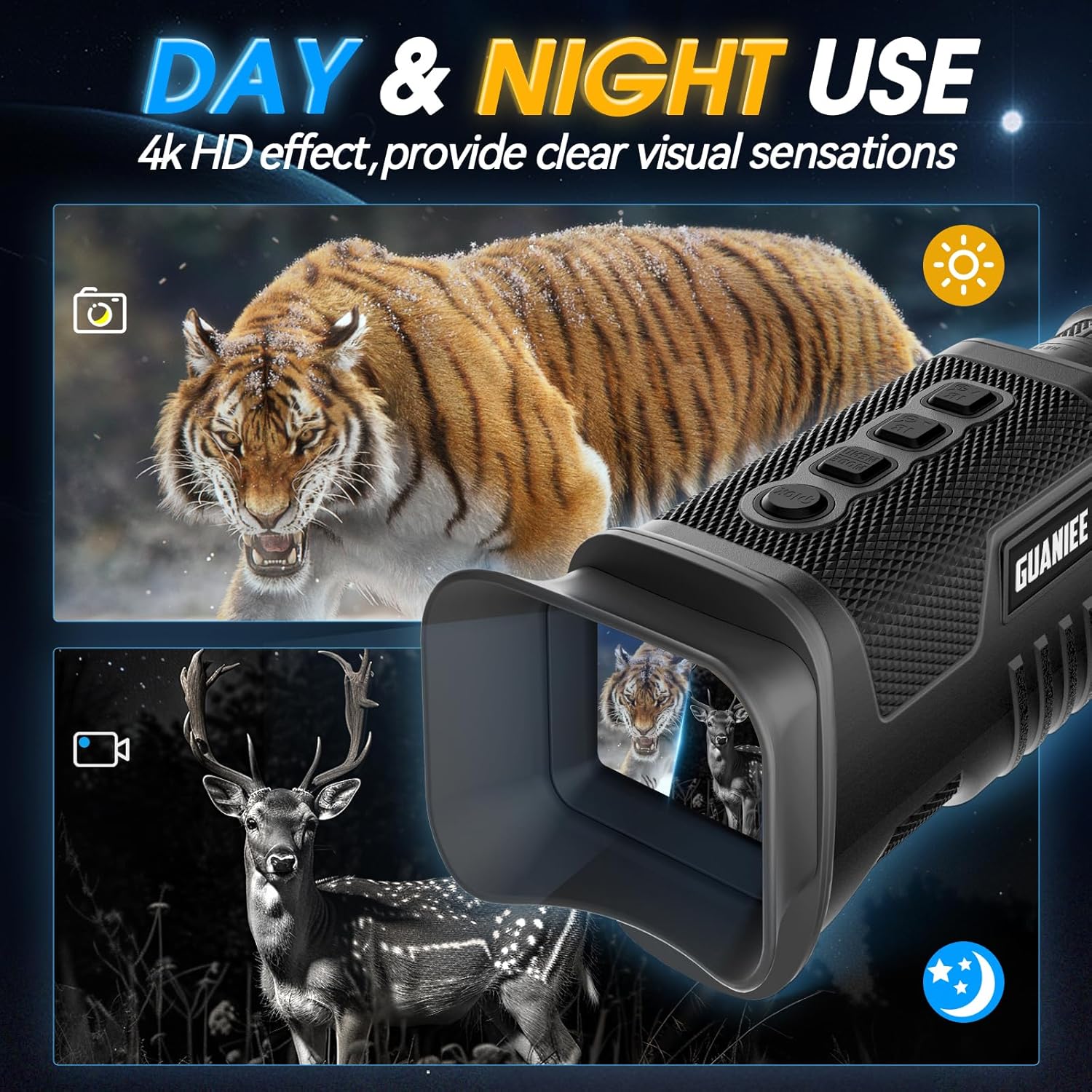 2" Larger Screen for Enhanced Experience: Experience the power of our night vision goggles with a 2-inch HD display. Witness every moment with remarkable precision, capturing 1080P videos and 8MP images. Our night vision will device captures wildlife and night adventures for you in unmatched detail. 3 modes: photo, video (with audio), and playback