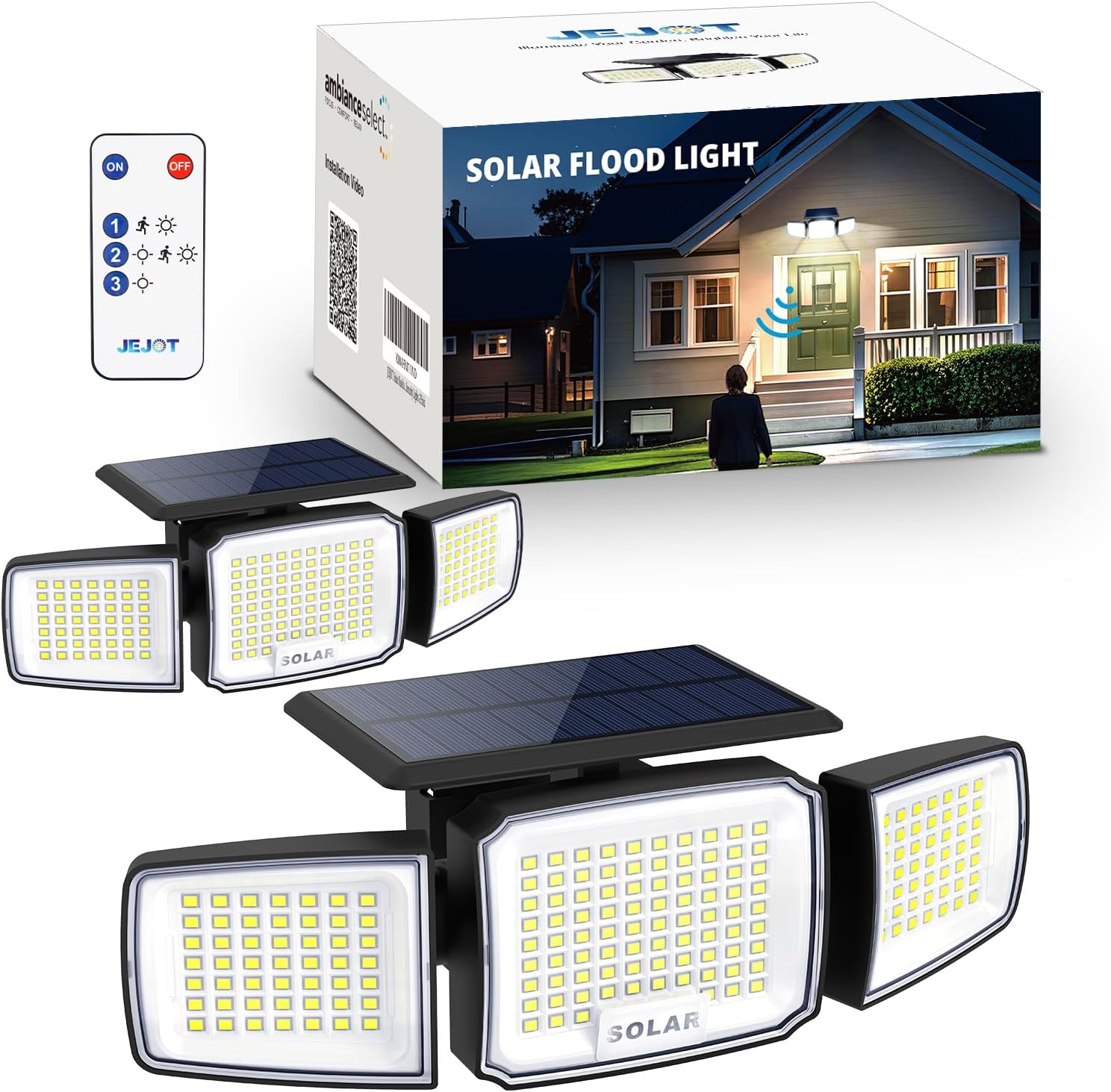 Solar Security Light Outdoor Super Bright LED w/Remote Control, Radar Motion Sensor Flood Light, 3 Heads 270° Wide Angle, IP65 Waterproof, 3 Modes (2 Packs)