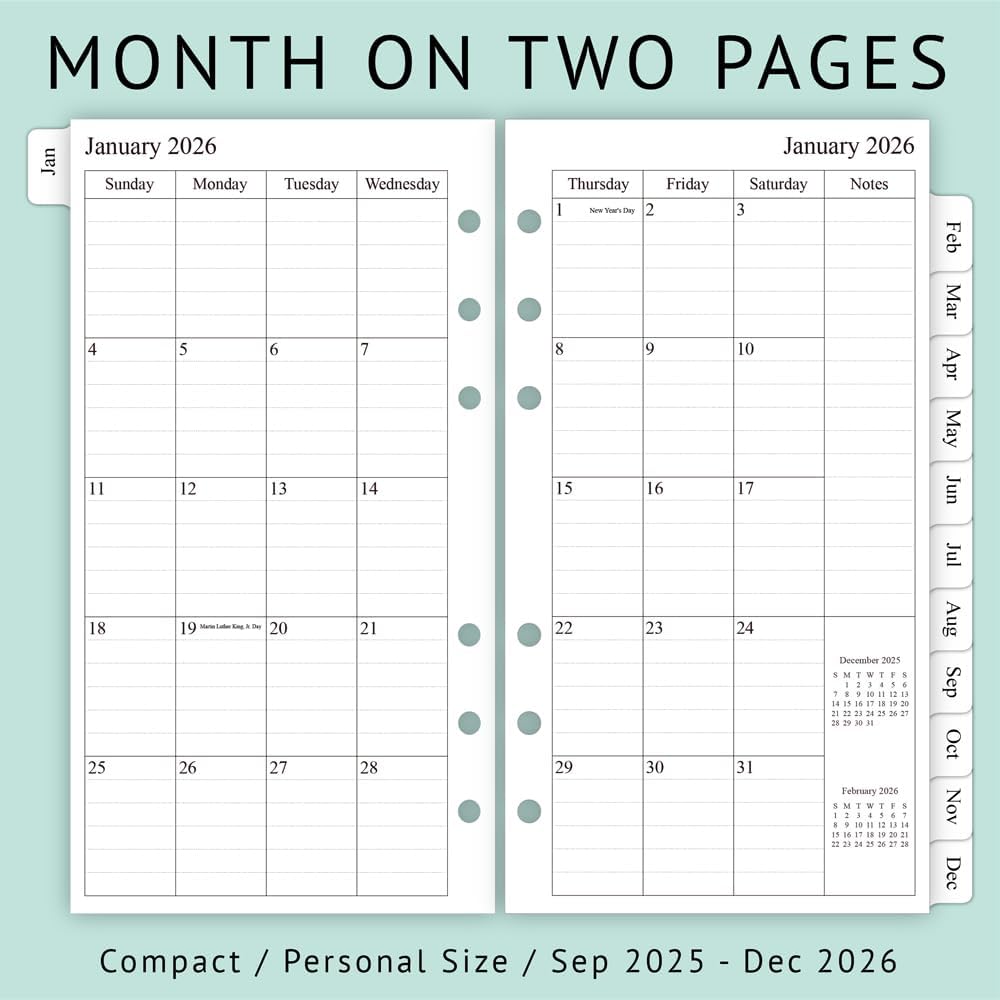 newestor 2025-2026 Planner Refill, Monthly, 3-3/4" x 6-3/4", Sep 2025 to Dec 2026, Personal/Portable Size