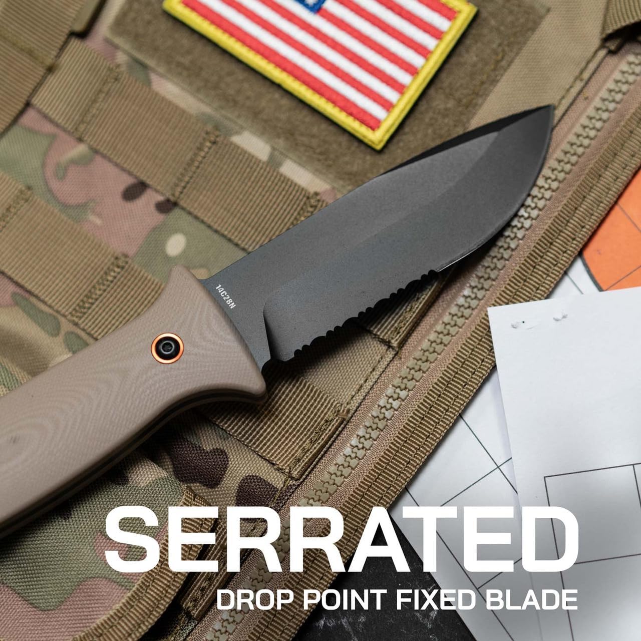 704 Gear Rogue Fixed Blade Knife | Serrated 4.5 inch 14C28N Steel Full Tang Blade, Textured G10 Handle, and Kydex Sheath with Carrying Clip | Flat Dark Earth