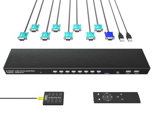 8 Port VGA KVM Switch with Remote, USB Switcher, 8 Computers Share 1 Monitor, 4 USB 2.0 Hubs, Keyboard Mouse Printer, 8 KVM VGA Cables, 1 Desktop Controller, 1 IR Remote