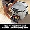 Meet the Ninja FrostVault - the cooler with premium ice retention and fridge-temp dry storage. With FrostVault Technology, cold transfers into the Dry Zone to keep food cool, dry and separate at food-safe temperatures (under 40° F) for days. 30-quart capacity fits up to 48 cans – plenty of room for all your favorite drinks. Streamline your outdoor adventures with heavy-duty construction and premium lid, latch and handles for easy access, storage, and transport. The Ninja FrostVault wheeled cooler is a must-have for any camping or fishing trip, easily rolling alongside your gear like tents, cots, tables, and chairs. Whether you’re packing fishing rods, lines, lures, or beach essentials like umbrellas, towels, and blankets, this cooler keeps everything fresh. Perfect for beach vacations, it pairs well with stylish beach bags, coverups, and women’s fashion accessories to complete your vacation essentials.