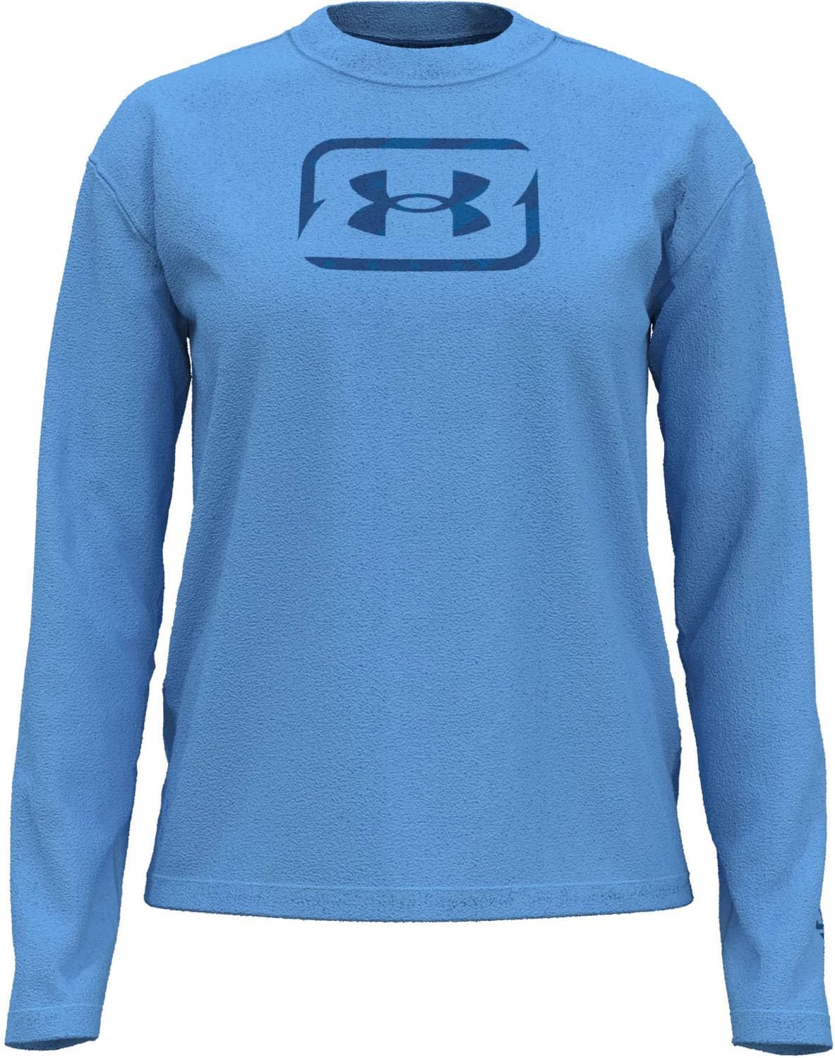 Experience comfort and style with this UnderArmour Women's Long Sleeve Shirt, designed for outdoor enthusiasts and athletes alike. This loose-fit, Carolina Blue shirt features a round neck and long sleeves with a cuff style, perfect for a relaxed yet sporty look. Crafted with a blend of Nylon and Polyester, it offers excellent moisture-wicking and quick-drying properties, keeping you comfortable and dry during intense activities. The Iso-Chill fabric disperses body heat, providing a cool-to-touch feel, while the mesh back panel ensures added ventilation. With UPF 50+ sun protection, this shirt safeguards your skin from harmful rays. The shirt is available in a Medium size, fitting regular body types, and is machine washable with low heat tumble drying for easy care.