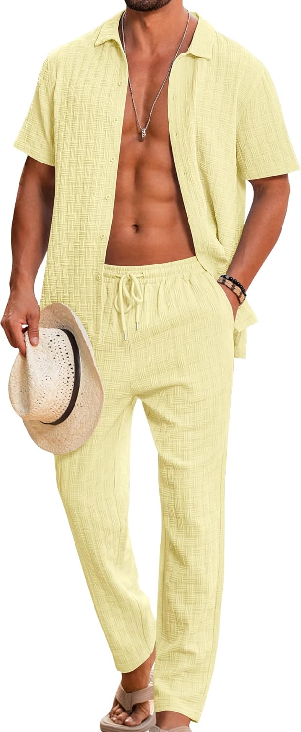 LecGee Mens 2 Piece Outfits Textured Short Sleeve Button Down Shirts and Matching Loose Pants Beach Party Suits