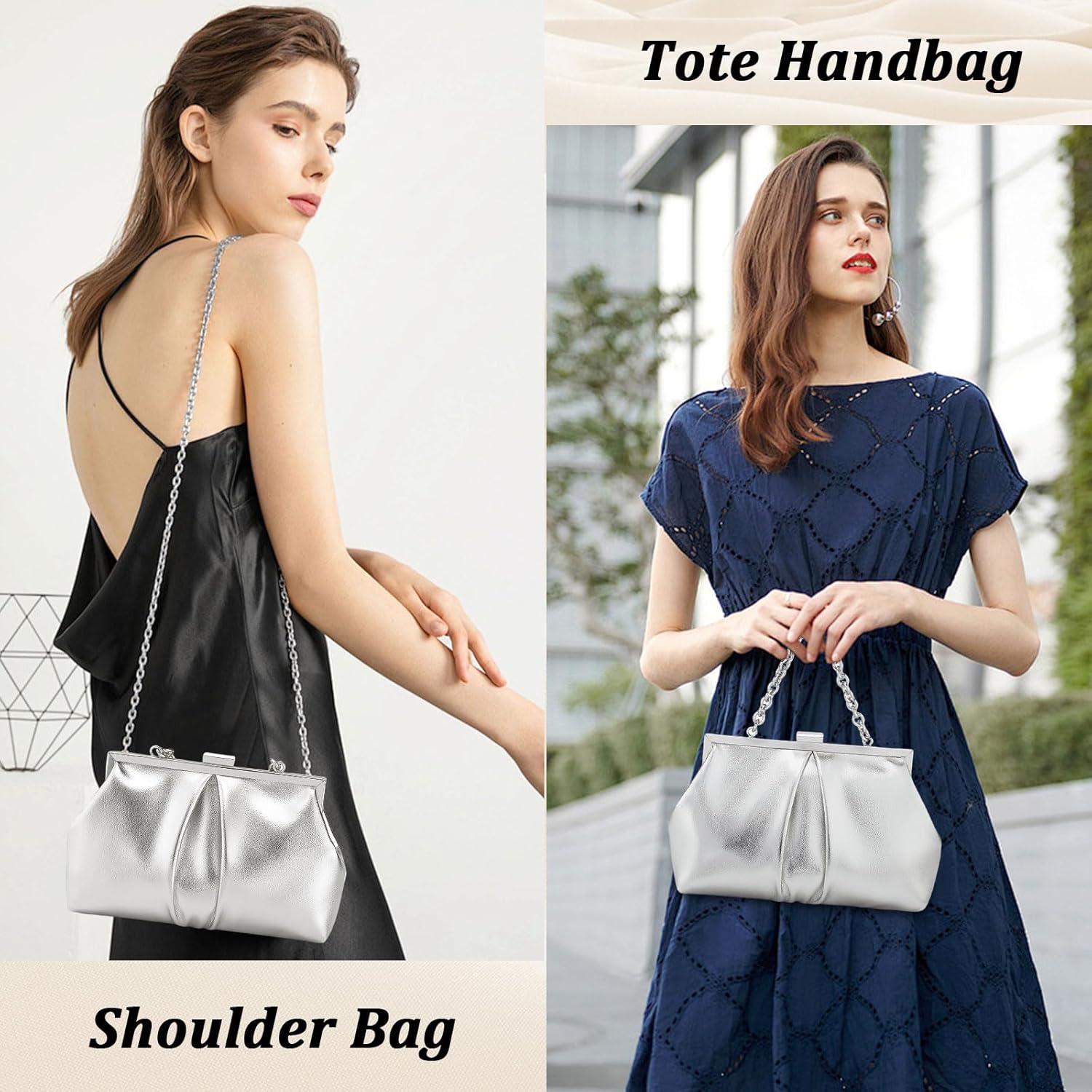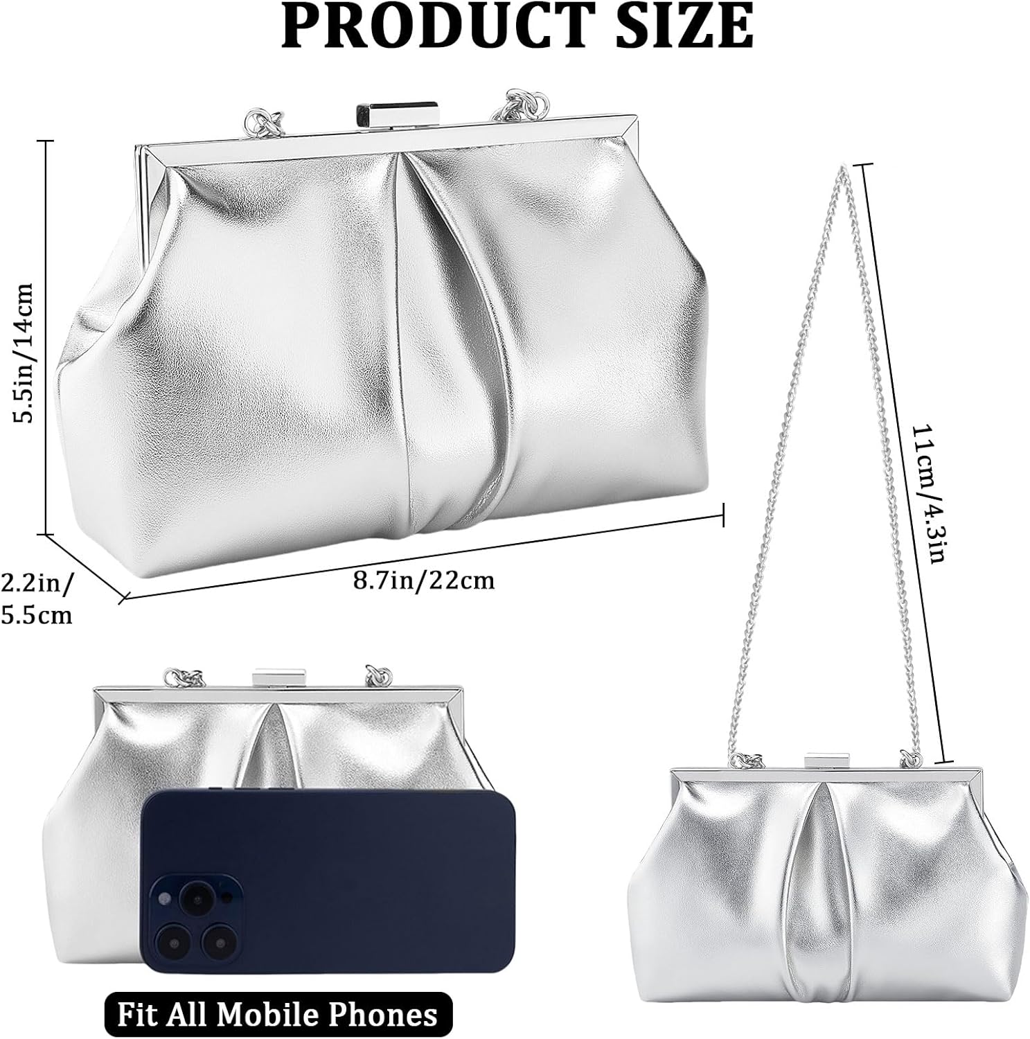 Enhance your evening style with this stylish PU leather dressy purse! Size: 8.7*2.2*5.5 in/22*5.5*14 cm(L*W*H) Material:Made of premium PU leather. Color Options: Small sliver clutch, gold clutch purse for wedding and airport handbag. Capacity: This clutch purses for women formal have enough space to accommodate wallets, cosmetics, sunglasses, headphones, lipstick, keys, mobile phones or other daily necessities, etc. Design: This evening clutch comes with an removable chain, could offer versatile carrying options for you, 3-in-1 style, can use as a evening handbag, womens clutch purse, shoulder bag, or crossbody purse. Occasion: Could use as evening party purse, wedding purse, cocktail purse, bridal purse, prom purse, party clutch, dating purse, nightout purse, club handbag, banquet purse and so on.