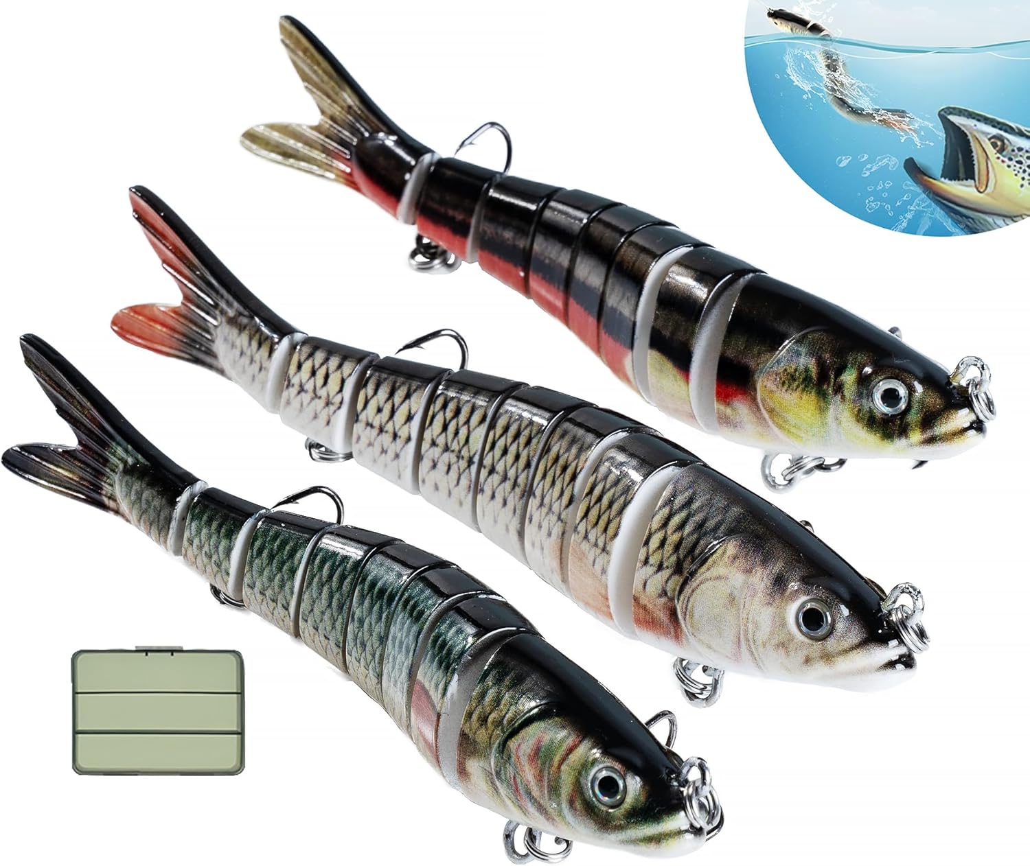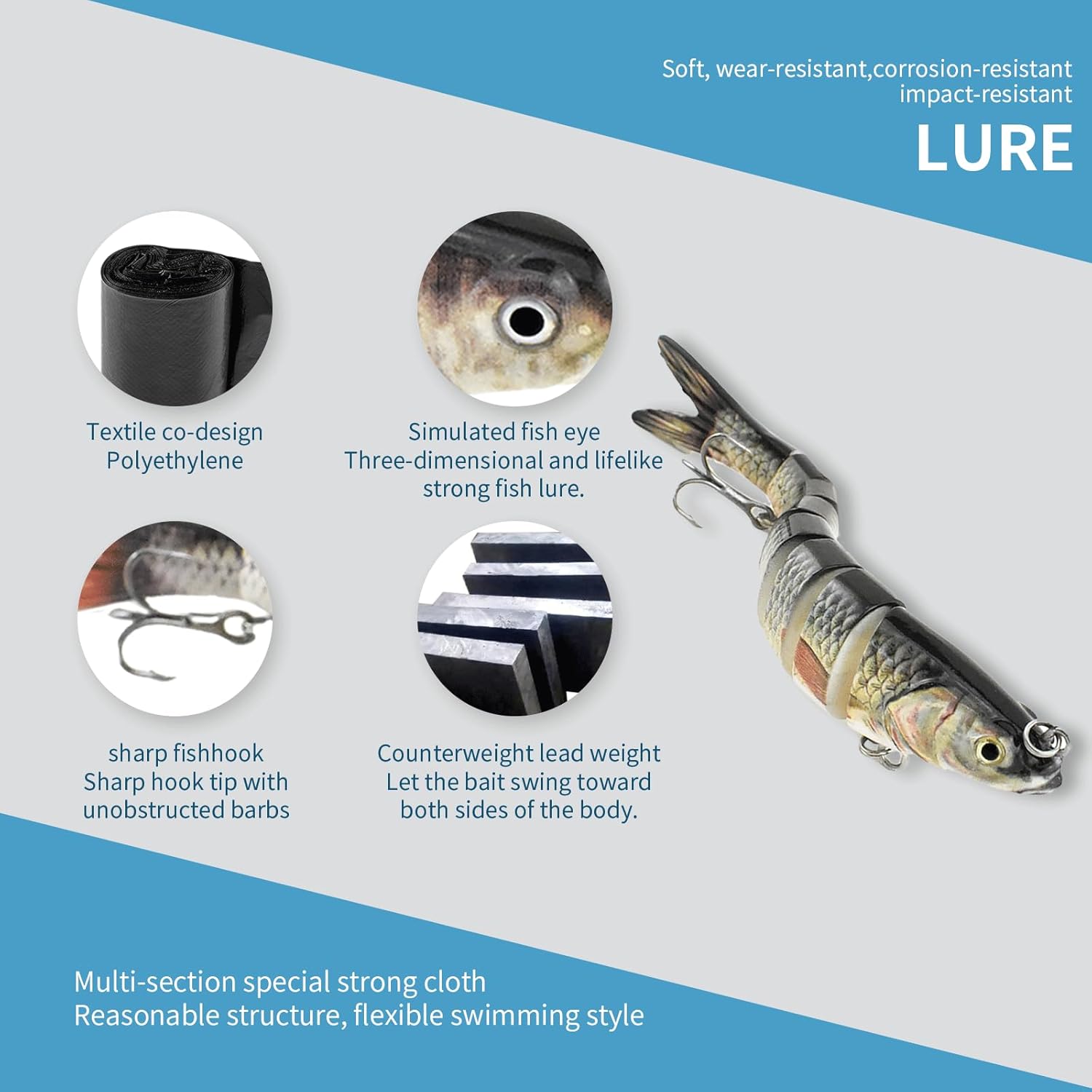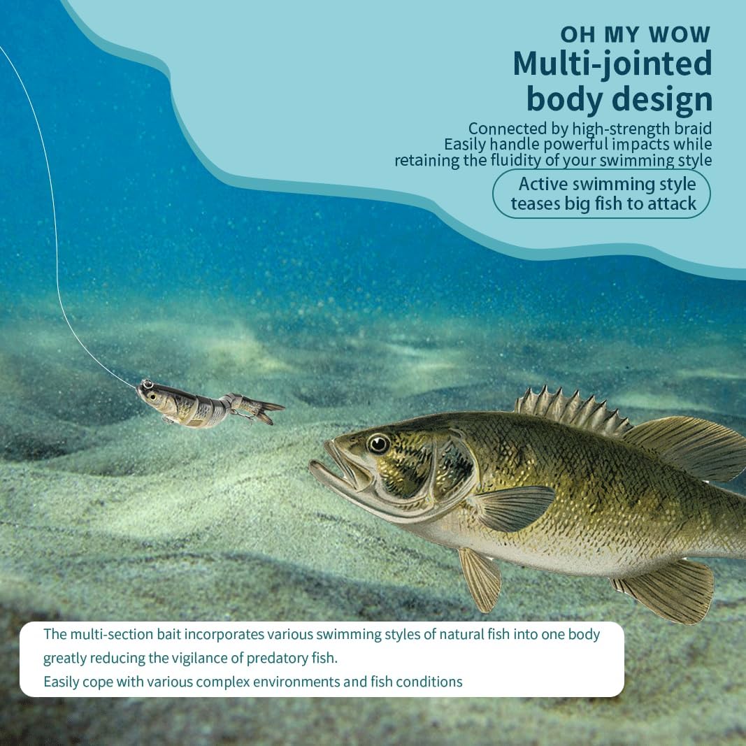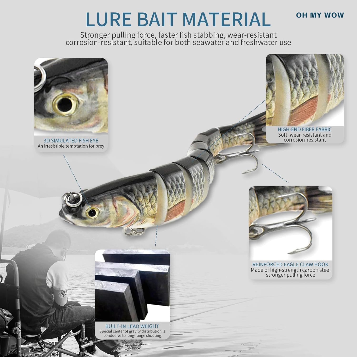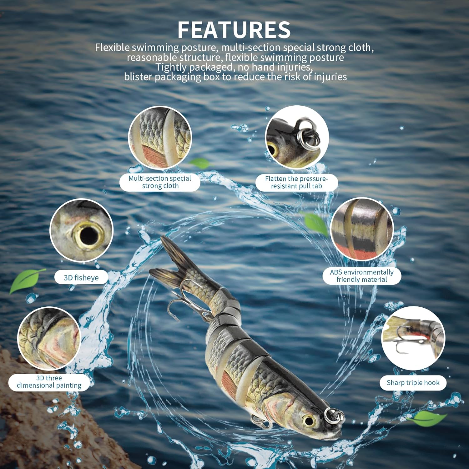 Bass Lures with Colliding Joints for Irresistible Sound: These bass lures feature joints that collide during movement, producing a bell-like sound that mimics distressed prey. This sound attracts bass, walleye, and other predator fish, enhancing their effectiveness as swim baits and jerk baits for bass fishing. Perfect for freshwater and saltwater fishing, the unique noise triggers aggressive strikes from fish.