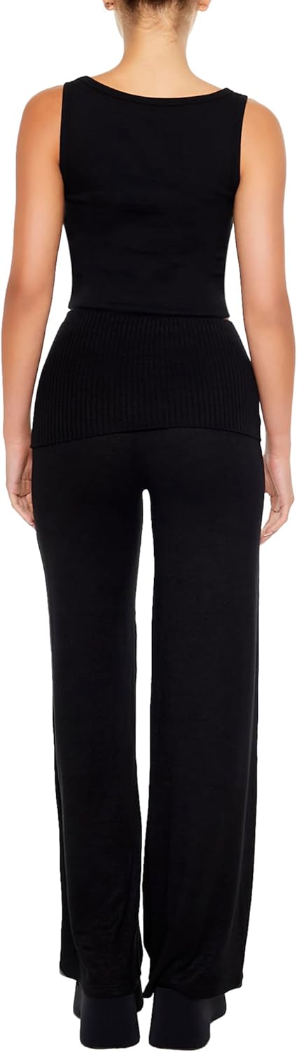 A pair of knit pants featuring a foldover waistband with a ruched drawstring design, straight leg, and a mid-rise.