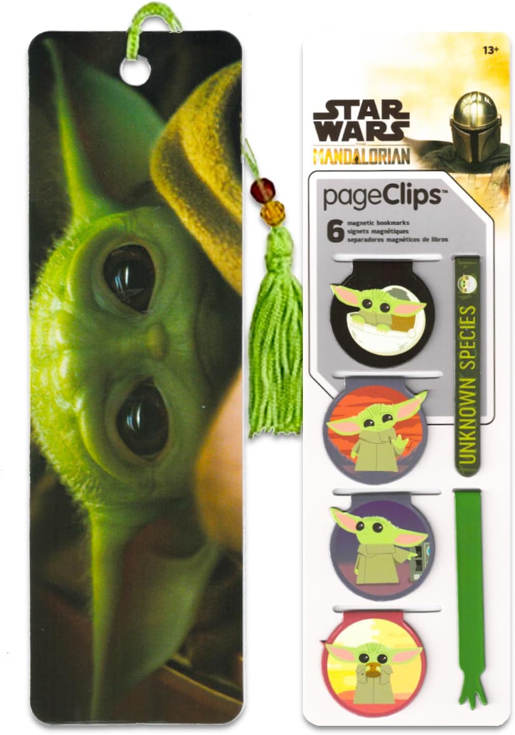 This Star Wars school supplies bundle includes 6 Mandalorian The Child page clip bookmarks and 1 Star Wars Mandalorian bookmark.