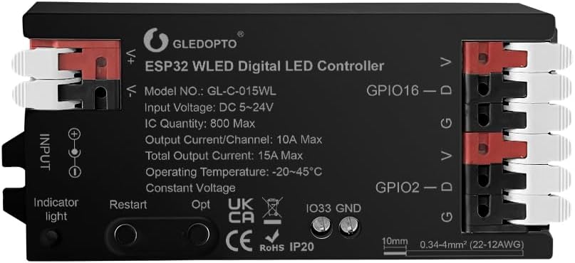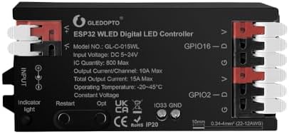 Product Name:ESP32 WLED Strip Light Controller Model No.:GL-C-015WL Voltage: DC 5-24V Chip: ESP32 IC Quantity: 800 Max Output Current/Channel: 10A Max Total Current: 15A Max Size: 108*45*18mm Operating Temperature:-20-45°C Supported Strip: WS2811, SK6812, SM16703P, WS2812, etc
