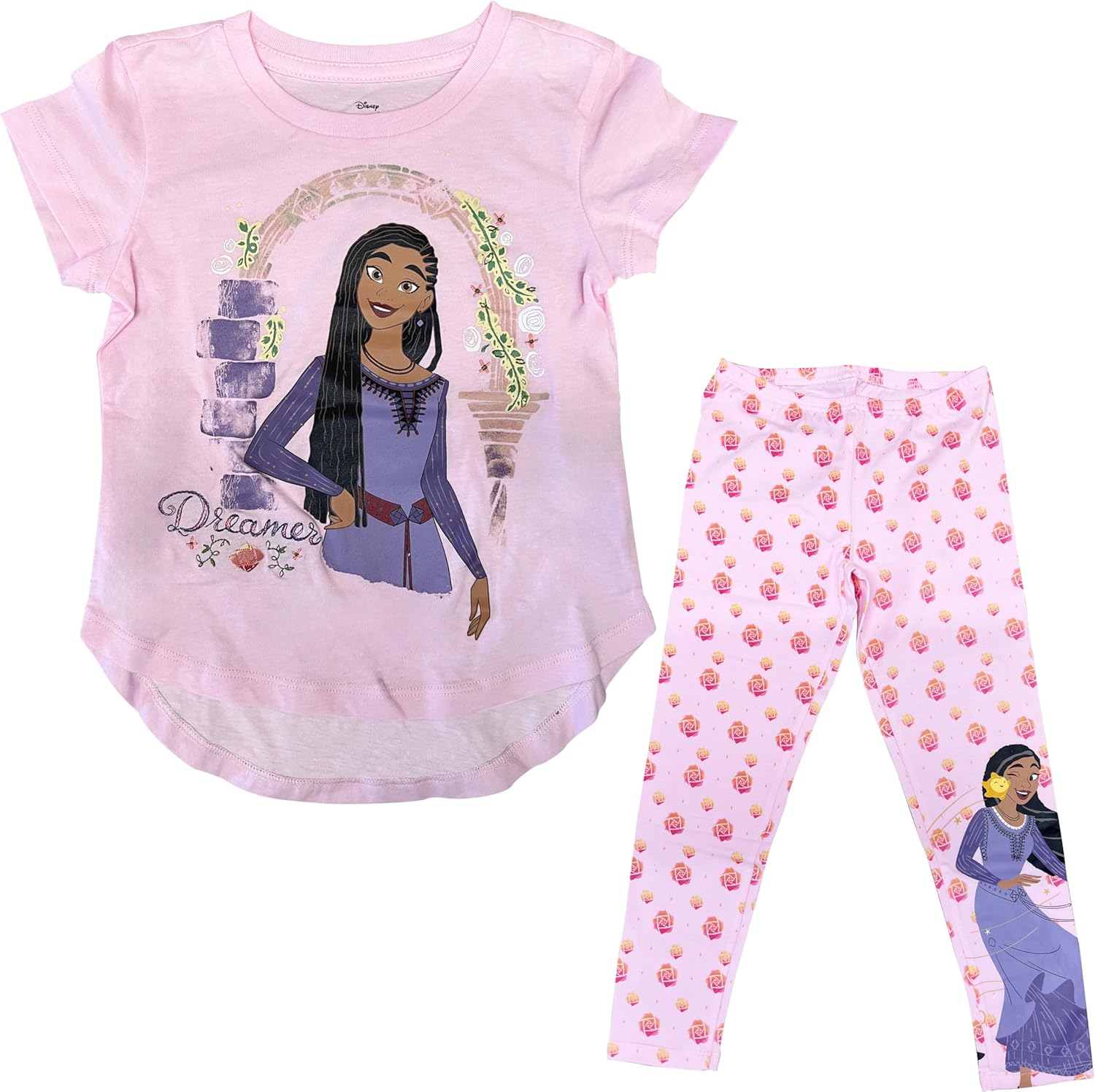 Disney's Wish Girls' 2-Piece T-Shirt and Legging Set – Officially Licensed Disney Clothing Let your little one shine with the magic of Disney's Wish in this officially licensed 2-piece t-shirt and bike short set. Featuring vibrant screen-printed graphics with glitter/crystalline on the t-shirt and matching all over screen-printed graphics on the legging. Featuring all the charm and adventure of the movie, this outfit is perfect for fans of the beloved characters.. The design highlights characters like Asha, Valentino, and Star, making it perfect for fans of the heartwarming tale. Made for comfort and style, this set is available in girls' sizes 4-16, making it a must-have for any young Disney fan. Turn every day into an adventure with this magical Disney's Wish outfit!