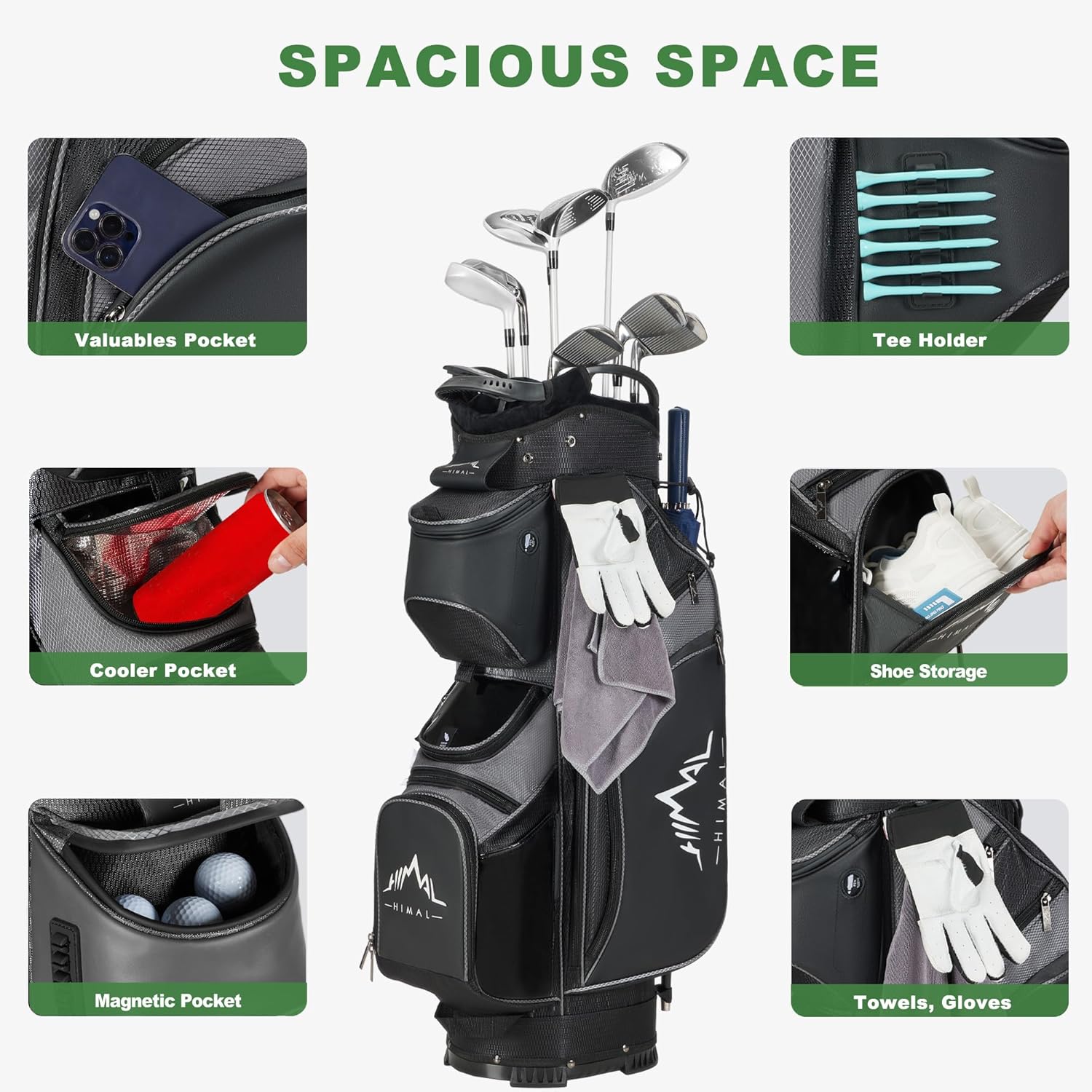 14-Way Golf Cart Bag with Full Length Divider, Premium PU Leather Golf Bag with Plush Top, Magnetic Pocket and Rain Cover for Men
