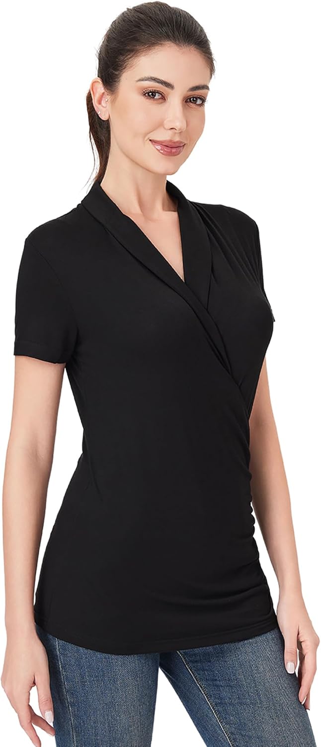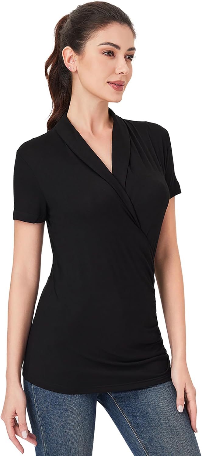AmélieBoutik Women Casual V Neck Wrap Top Ruched Short Sleeve Office Dressy Blouse Top Asymmetrical Elegant Shirts