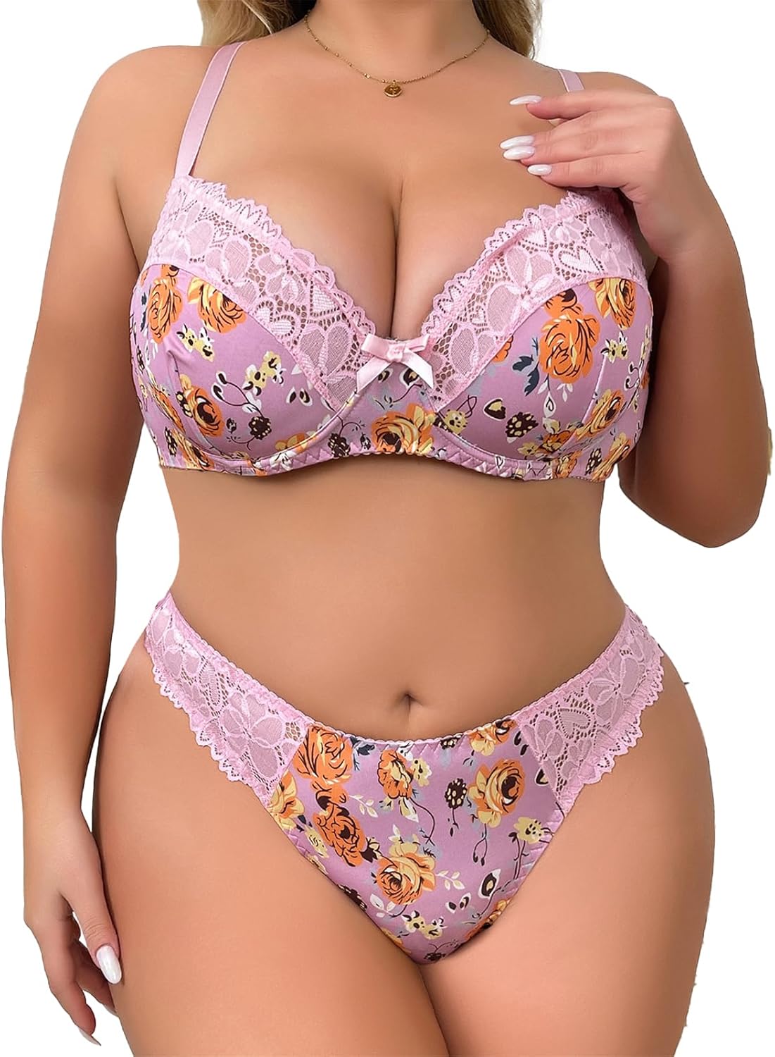 Womens Plus Size 2 Piece Lingerie Set Sexy Floral Lace Underwired Push Up V Neck Bra Babydoll Outfits Nightwear
