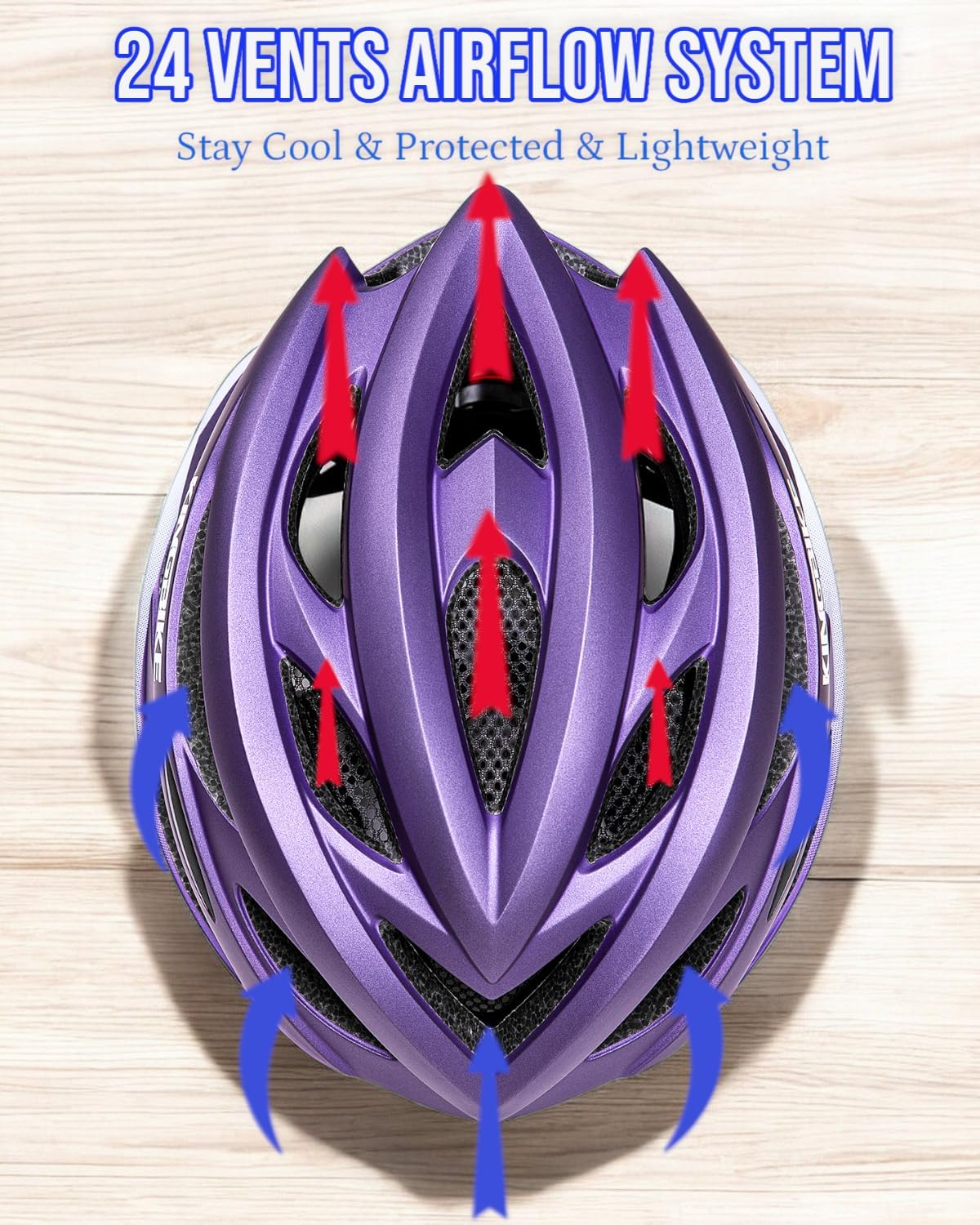 Cool and Lightweight Design: This bicycle helmet is designed with 24 breathable vents, making your biking more effortless and comfortable. Weighing only 260g (0.57lb), this cycling helmet offers an ultimate free and comfortable biking experience, making it ideal for road cycling and mountain biking.