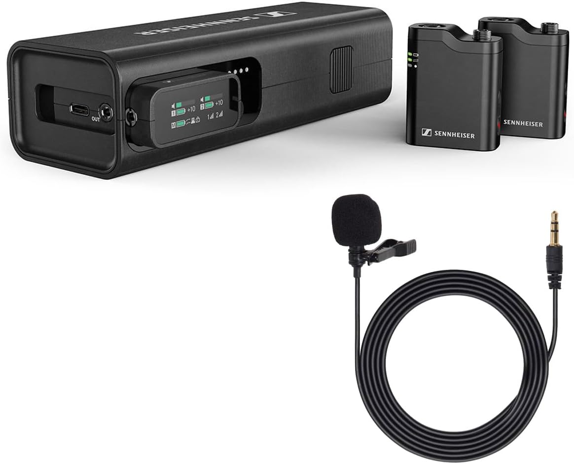 An innovative solution for capturing pristine audio, the Sennheiser Profile Wireless 2-Channel Microphone System with Turnstile Lavalier Microphone is an all-in-one clip-on and handheld microphone system designed for freelance creators and videographers. This compact system includes a two-channel 2.4 GHz receiver, two high-quality clip-on microphones, and a range of versatile mounting and connection accessories. These components are conveniently housed in an ultra-portable charging bar that also functions as a handheld interview microphone, offering unmatched versatility.Designed with simplicity and convenience in mind, the Profile Wireless system seamlessly connects to cameras, laptops, phones, or can be used as a desktop microphone. All essential components are neatly stored within the system's portable charging bar, ensuring you have everything you need at your fingertips. The inclusion of a handheld microphone further enhances its adaptability for various recording scenarios.Renowned for its signature Sennheiser sound quality, this system leverages decades of German audio engineering expertise to deliver exceptional audio performance without compromising on ease of use. The Profile Wireless system ensures you capture sound with confidence, thanks to its advanced features.One of the standout features is the Audio Clipping Protection, which provides internal recording capability on each clip-on microphone, allowing you to capture backup audio files e