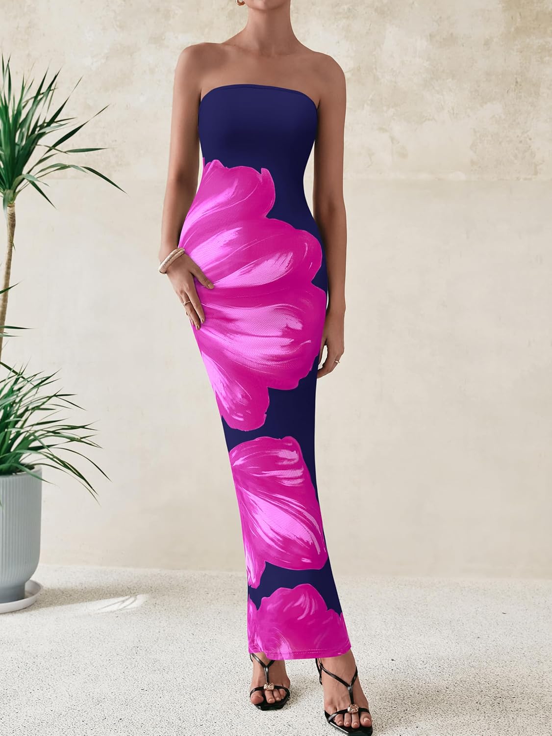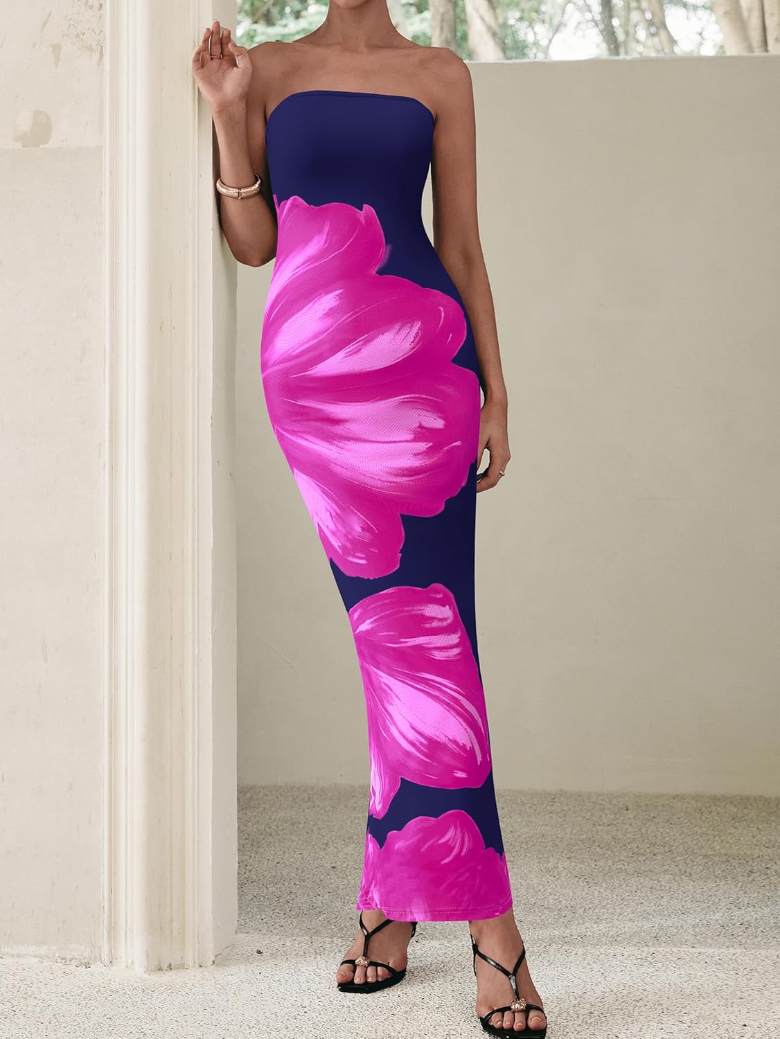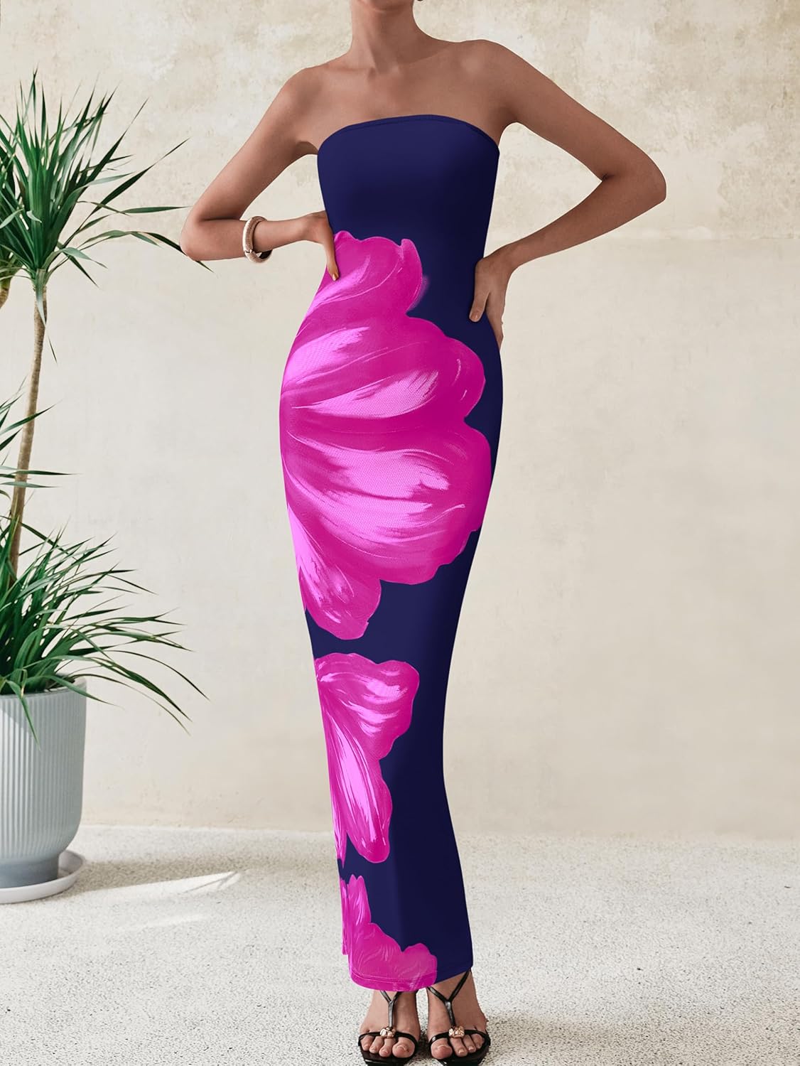 PRETTYGARDEN Women Summer Strapless Maxi Dress Bodycon Floral Sexy Long Wedding Guest Dress Formal Tube Mesh Cocktail Dresses