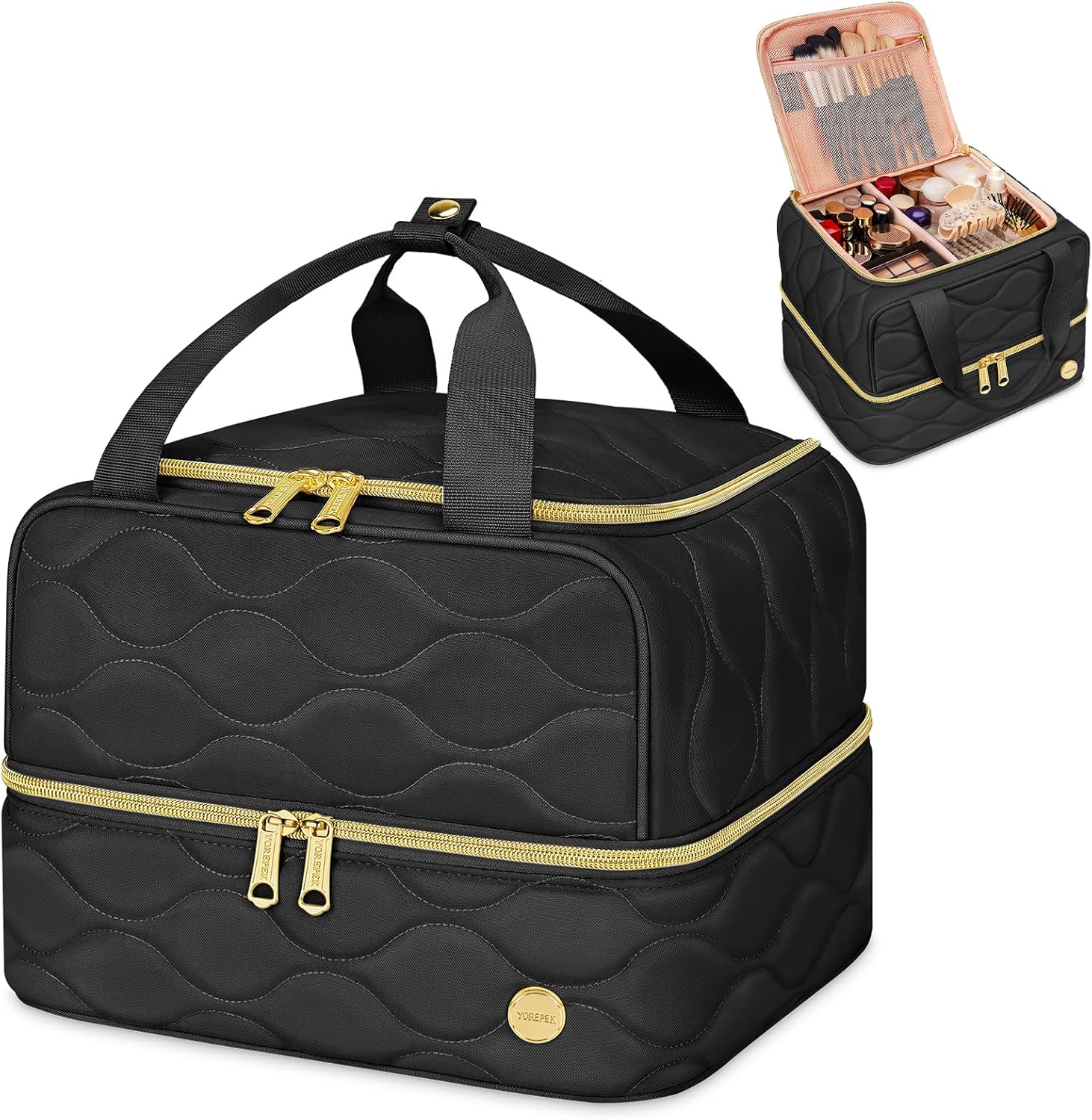 YOREPEK Travel Makeup Organizer Bag, 2-Layer Cosmetic Bags for Women, Portable Makeup Box Cases for Daily Use, Skincare, Brushes, Powders, Palettes, Makeup Tools– cosmetiquera para maquillaje,Black