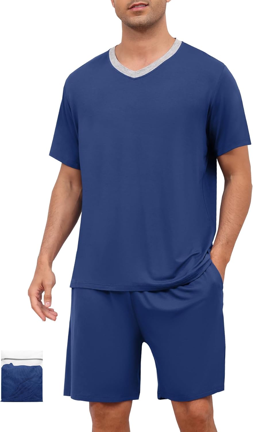Mens Pajama Set Short Sleeve Sleepwear Summer Lightweight Pjs Set 2 Piece Comfy V-Neck Nightwear With Pockets S-3XL