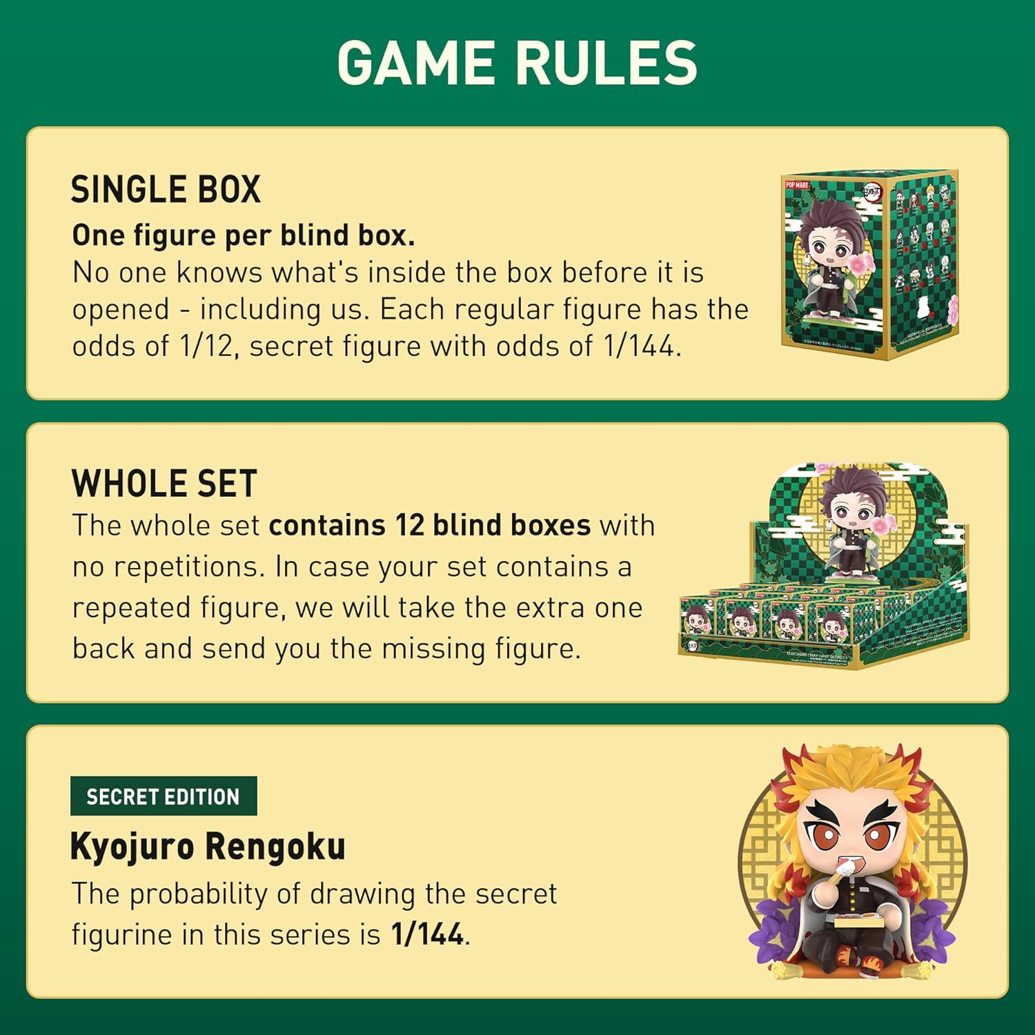 POP MART Kimetsu no Yaiba Birth Flower Series Figures: The blind box contains a random figure from a specific series. Each blind box only contains one figure. No one, including us, knows what's inside. This collection contains 12 blind box figures, one of them might be the secret edition.