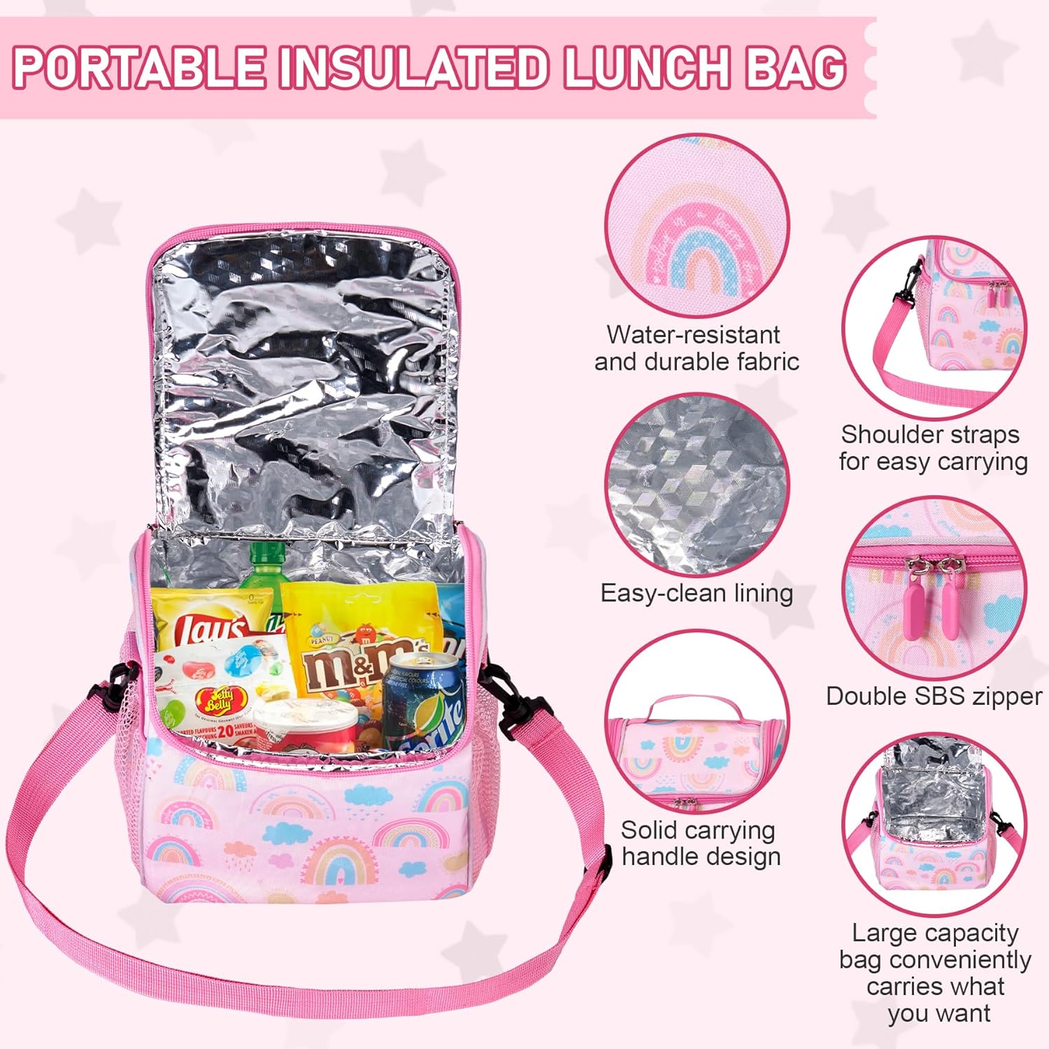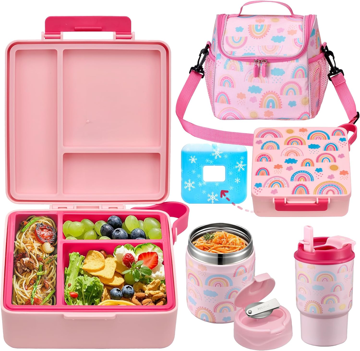 Bento Lunch Box for Kids with 17oz Soup Thermo,Insulated Tumbler Water Bottle and Insulated Lunch Bag,Leak-Proof 3 Compartment Lunch Food Container with with Ice Pack for Kids to School-Rainbow